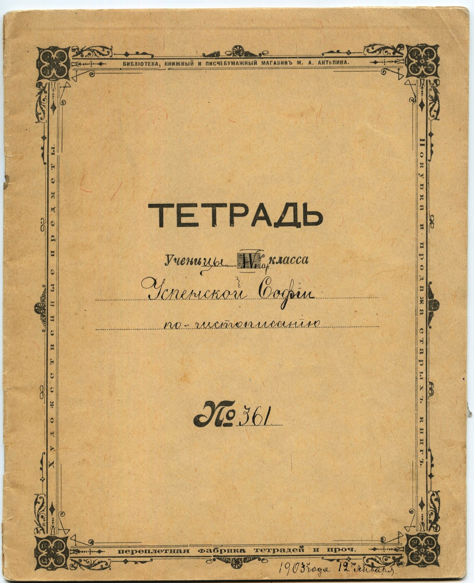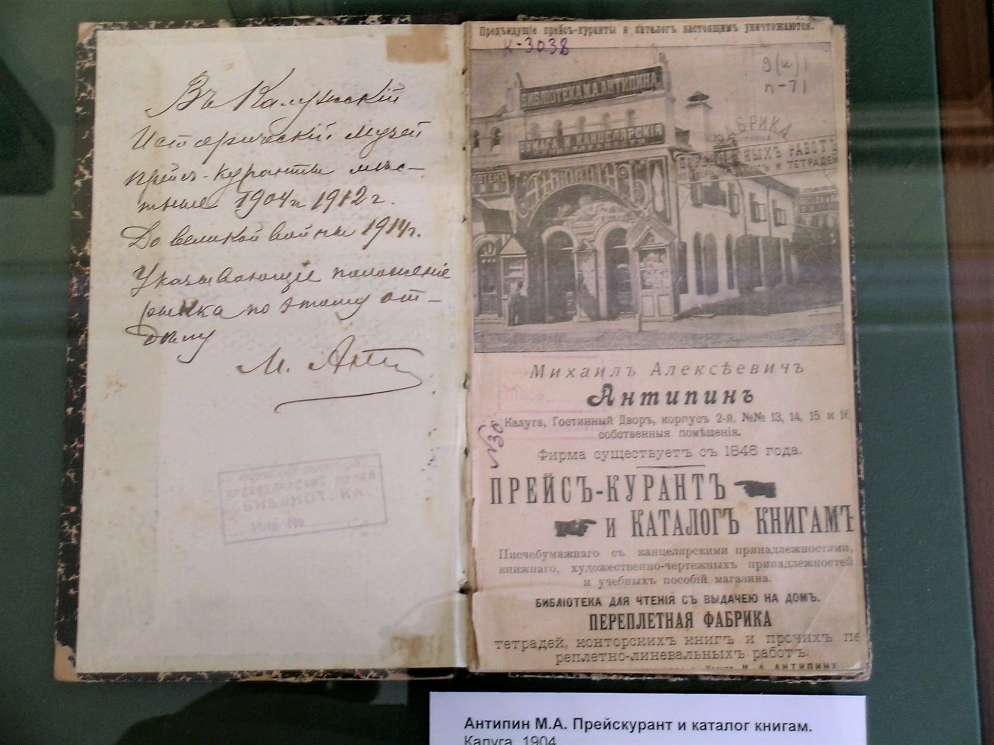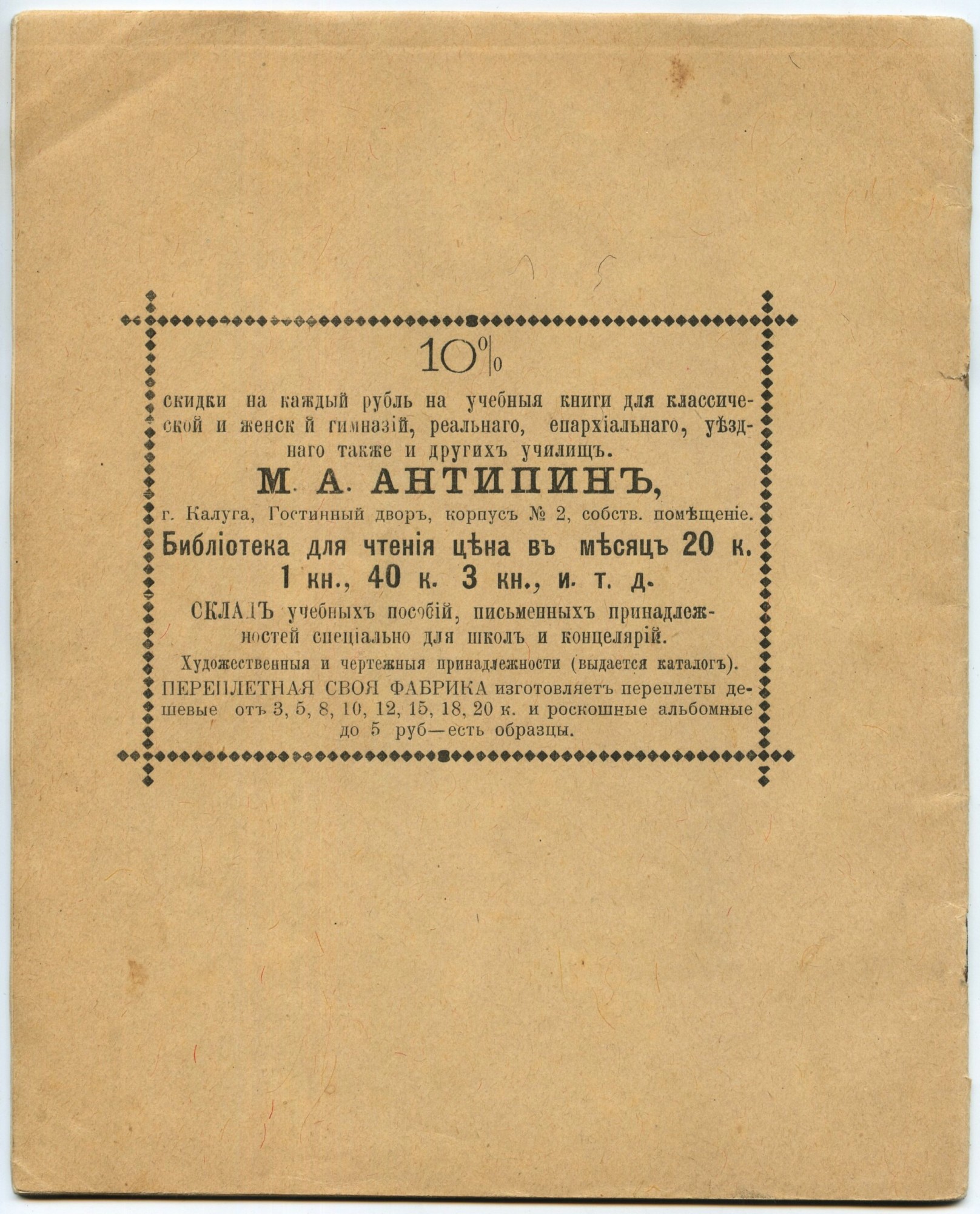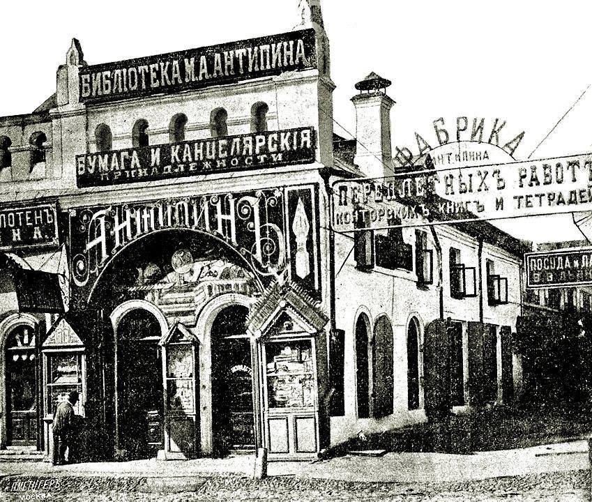 | А это - описание ассортимента магазина Антипина. Не знаю, каким образом автор текста (Евгений Фридгельм), опубликованного на калужском сайте получил все эти сведения, но он с детальной точностью описал ассортимент дореволюционного писчебумажного магазина. Предполагаю, что это описание напрямую не связано с магазином Михаила Алексеевича, просто автор обобщил известные ему сведения о канцелярских принадлежностях дореволюционного периода. Тем не менее, текст любопытный. Читайте и удивляйтесь! :) "Самый ближний отдел, у входа — «Писчие бумаги». Их поставляют, в основном, Акционерное общество Ржевских писчебумажных фабрик, Троицко-Дашковская фабрика (недалеко от Угодского завода) и Компания Говарда (за Полотняным). Бумага разложена по стопам и классифицируется по размеру, объему стопок, качеству и толщине листа. «Здесь, — разъясняет приказчик, можно найти самую, что ни на есть, по душе. Хотите тонкую? Пожалуйста. Плотную или среднюю? Вот и оне. Одних названий сортов — более десятка: „писчая“ (рубль двадцать за стопу), „министерская“ (по шесть с полтиной), а есть и высший шик"царская молочная» (шестьдесят копеечек за десяток, стопами ее не покупают). Здесь же, извольте, альбомы для пения в шагреневом коленкоре с партитурами для баса, тенора, альта и дисконта»." "...тетради по истории, разлинованные под запись дат и хронологии. Или специализированные тетрадки для мелкого, среднего и крупного почерков, чтоб удобно было. Особые.- «Каллиграф» — предназначены для исправления почерка. В них буквы тоненько прописаны для правильного обвода. Чтобы тренироваться в письме или оставлять записки домашним, приказчик рекомендует «аспидные» или пергаментные картоны, на которых легко чертить карандашом, а затем так же легко стереть написанное." "Конторские книги». Казалось бы, что может быть скучнее? Ан, нет. Каждый «гроссбух» — здесь настоящее произведение переплетного искусства. Крыт настоящей кожей с самым разнообразным тиснением. Производят их рядом с магазином, в соседнем корпусе Гостиных рядов — на переплетной фабрике Антипина. Функции конторских книг различны: деловые, аптекарские, алфавитные, копировальные, классные журналы, каталоги домашних библиотек, записные книжки. Последние представлены на витринах и полках особым разделом. Самая распространенная форма — в виде бумажника, с застежкой (рубль семьдесят пять), но есть и более дешевые: парусиновая с карандашом в корешке (по полтинничку), «Удобство» — с календарем и нужными городскими адресами. «Мое хозяйство» — специально для дам. В них напечатаны полезные советы, а половина книжки разлинована графами «приход-расход». Чековые книжки.: Масса блокнотов для врачей, гимназистов (с таблицей умножения). Всего пятьдесят шесть видов." "Следующий отдел. «Писчие принадлежности». Наивно было бы рассчитывать узреть здесь иную продукцию, чем карандаши и перья. Еще наивнее ожидать какого-то разнообразия в самом, что ни на есть, рядовом товаре. Отнюдь. До изобретения шарикового стержня еще сорок лет. Но авторучки уже есть. Нет, не те, которые постоянно макают в «непроливайки», а самые нормальные, с пипеткой для заправки чернил и колпачком. Их всего тут несколько экземпляров, жуткий раритет! Торговой марки «Фонтан» — явно предмет гордости хозяина магазина. По конструкции «вечное перо» напоминает черт
