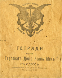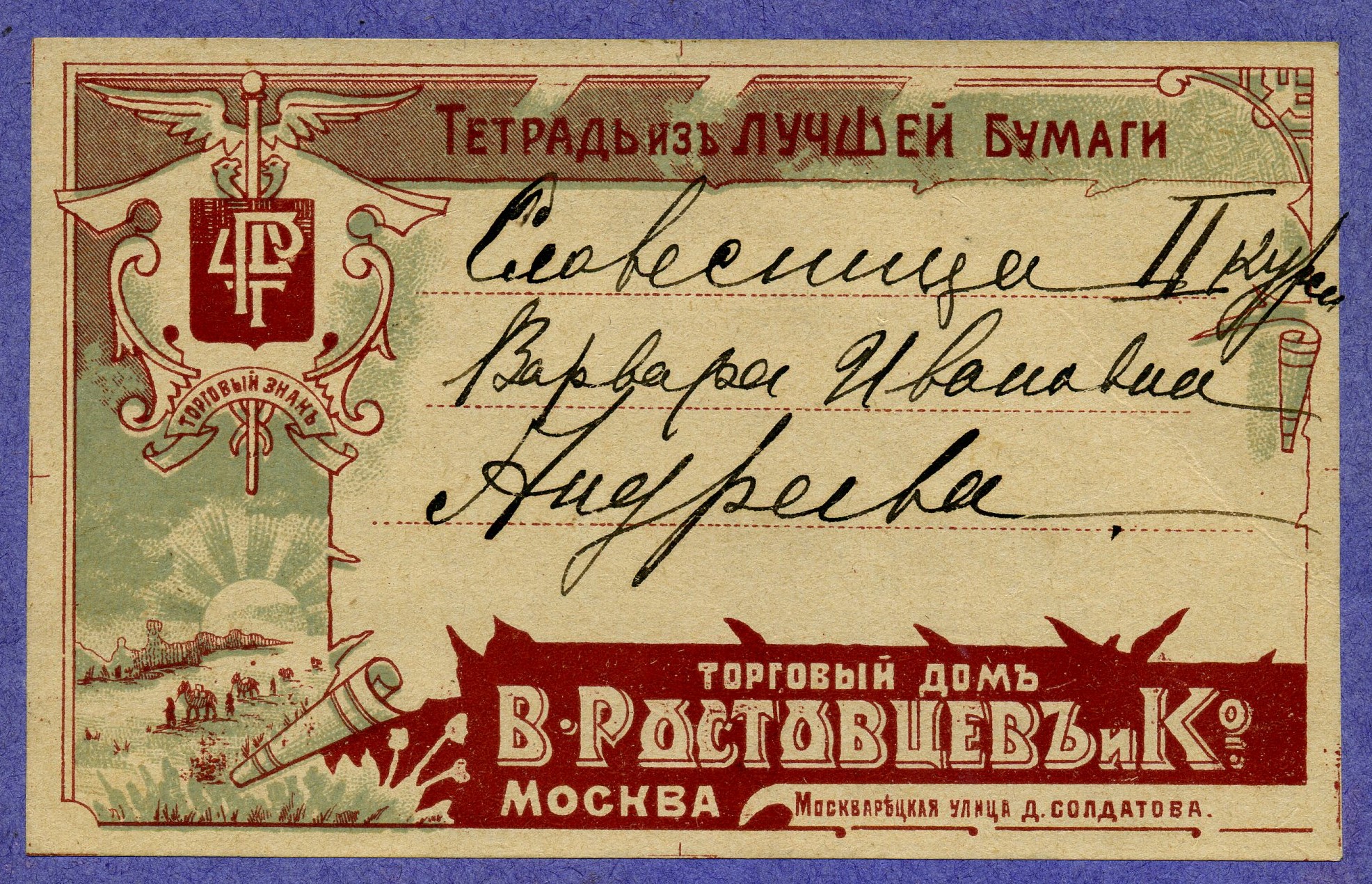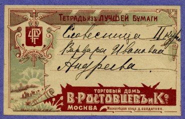 | Не удержался, чтобы не дать (два изображения выше) крупным планом элемент дизайна и торговый знак тетради этой самой вдовы И.И. Васильева. Чисто московская купеческая фантазия. Ну и раз уж зашла речь о необычных дизайнах, то в связи с этой темой также не могу не привести в качестве примера ещё одну московскую тетрадь – «Торговый Дом Ростовцев и К»: | |||||||||||