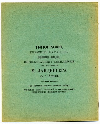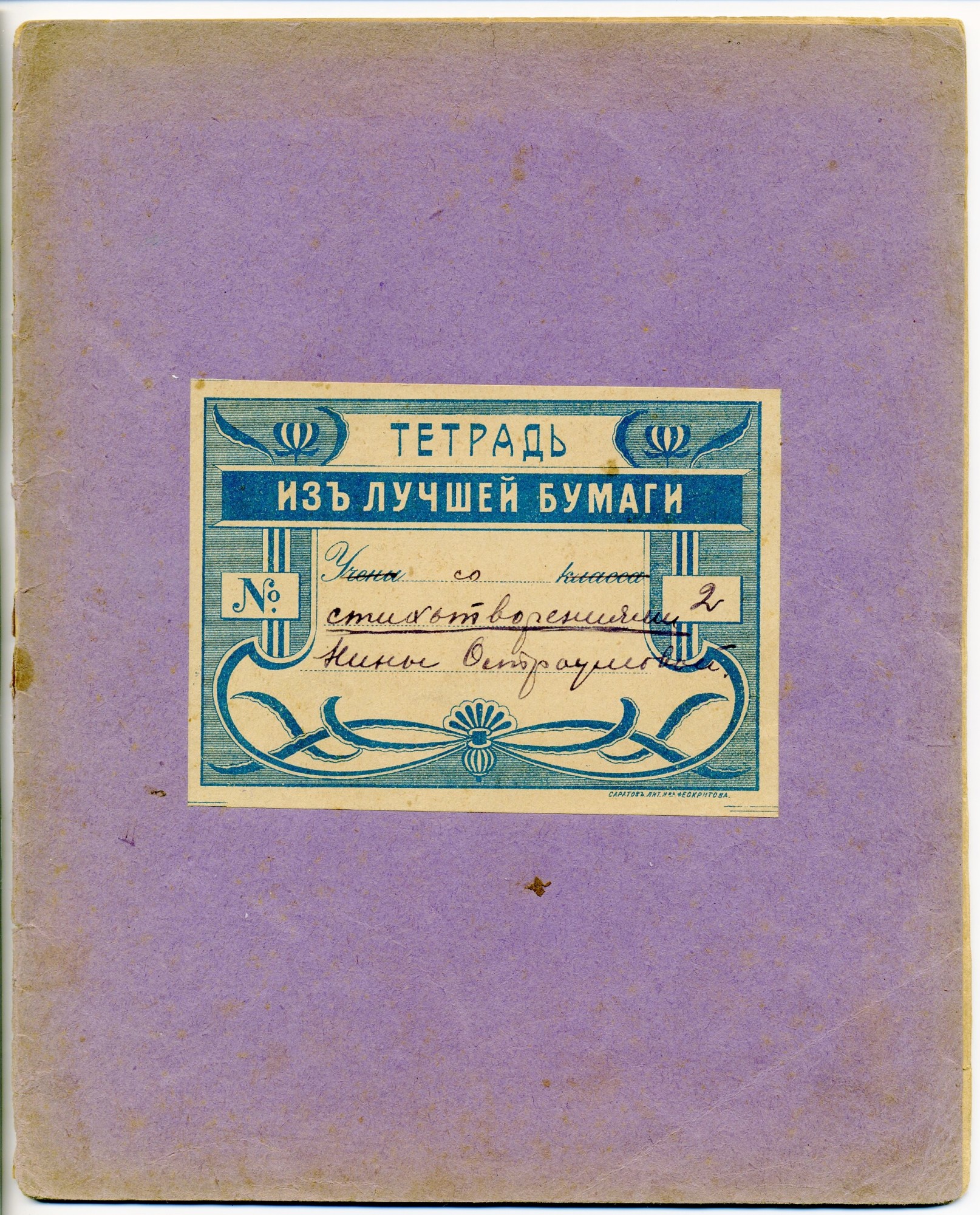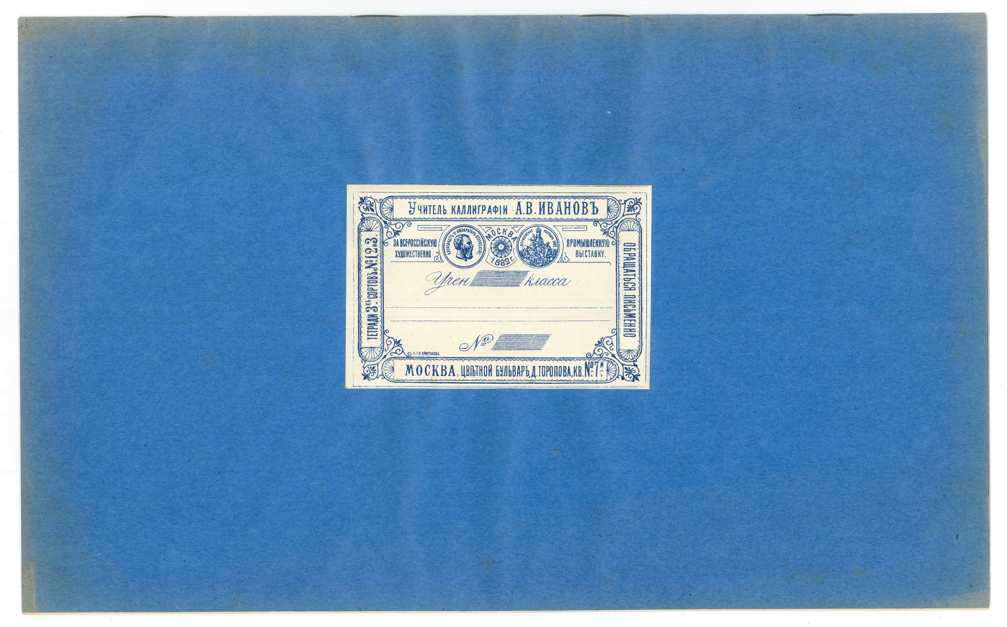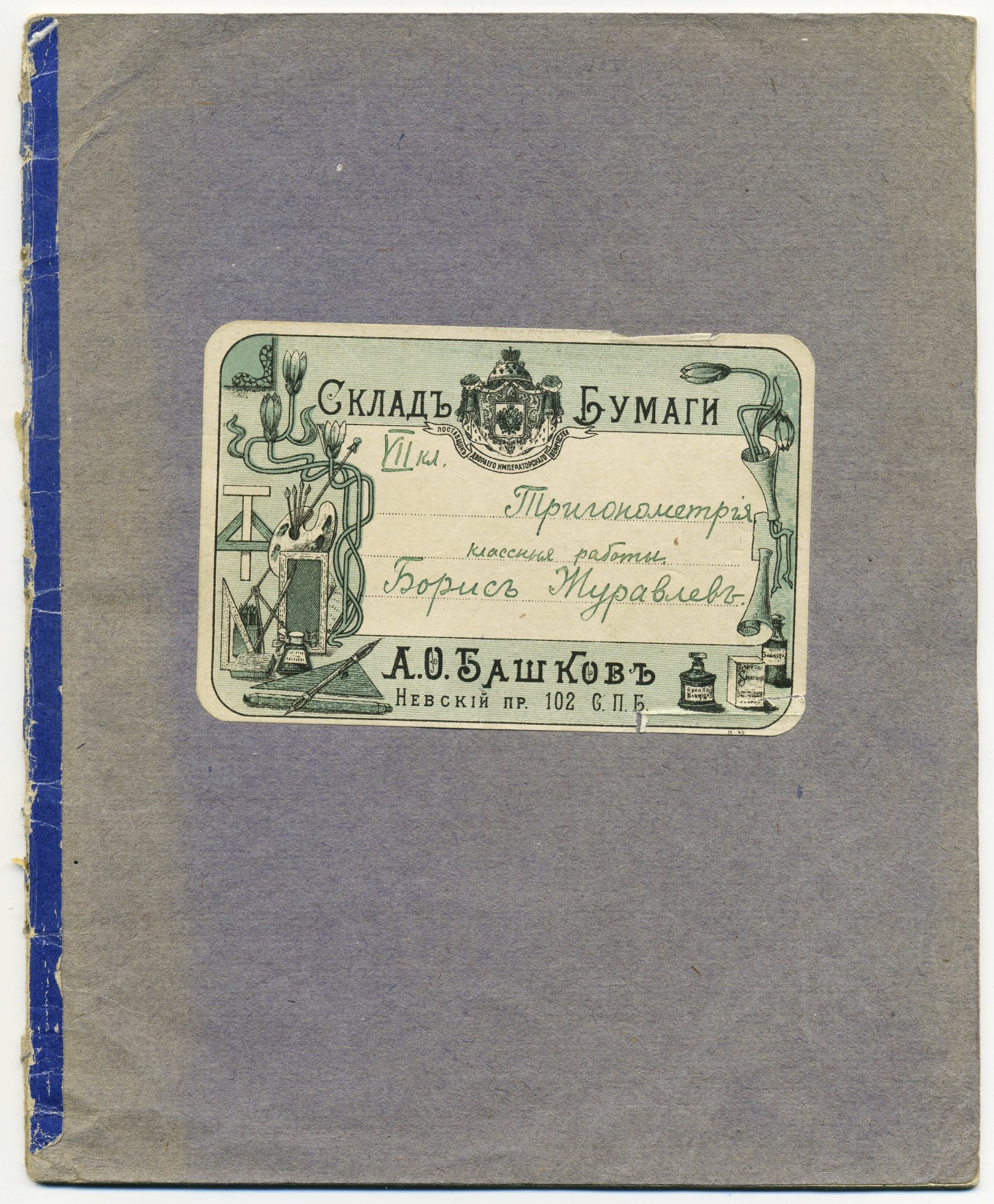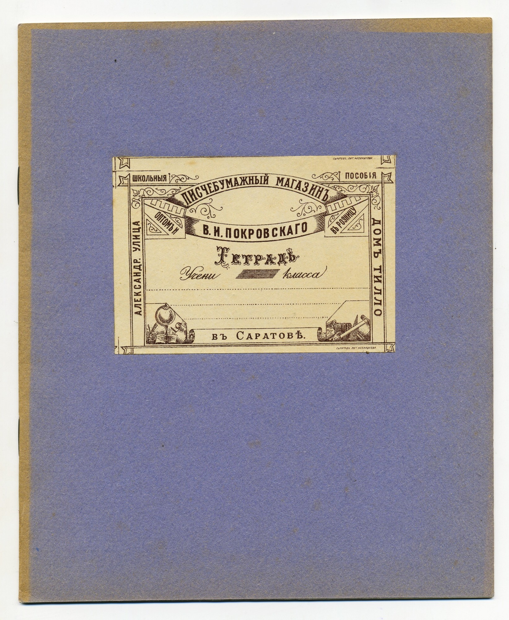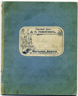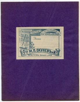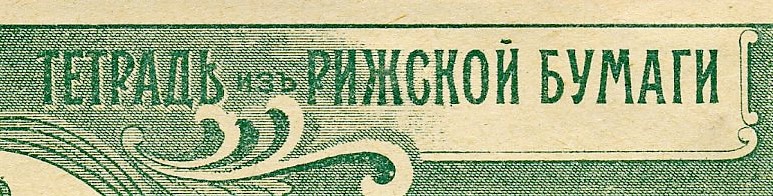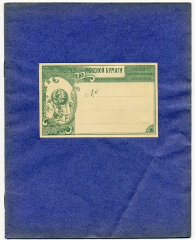 | В любом случае, дореволюционные тетради производили несколько большего формата, чем советские и современные российские. Причина проста, о ней я написал в начале статьи - лист писчего формата, принятого до революции (14 х 17,5 русских дюйма или 35,56 х 44,45 см.) для изготовления тетрадей складывали вчетверо, это и определяло размер самих тетрадей. "Писчий формат" на разных фабриках имел отклонения, обрезали не точно, отсюда и небольшие отклонения в размерах самих тетрадей. Исключения могли быть, но о них позже. Цвет обложки, как правило, был синим, кремовым, желто-коричневым либо зелёным. Скрепление в подавляющем большинстве случаев - строго на двух скобах. Тетрадь с тремя (!!!) скобами встретилась только у Поставщика Двора Его Императорского Величества (подробнее о ней - ниже). Промокашка – обязательна, различных цветов, либо чуть меньшего, чем тетрадь формата, либо и вовсе вполовину от тетради. Предполагаю, что сами пустые «болванки» (то есть тетради без наклеенных на них рамок) печатали где-то централизованно, затем их закупали местные типографии, под заказ печатавшие рамки для различных магазинов, а потом приклеивавшие рамки к «болванкам». Альтернативная версия – «болванки» закупали розничные магазины, размещавшие заказ на рамки в местной типографии и приклеивавшие одну к другой уже у себя. Тем более, что часть магазинов владела собственными, насколько я понимаю, небольшими типо-литографиями. Но были и тетради с безымянными рамками (без упоминания какого-либо магазина), что говорит в пользу первой версии. Возможно обе версии являются верными, а, значит, оба способа производства существовали параллельно. | |||||||||||