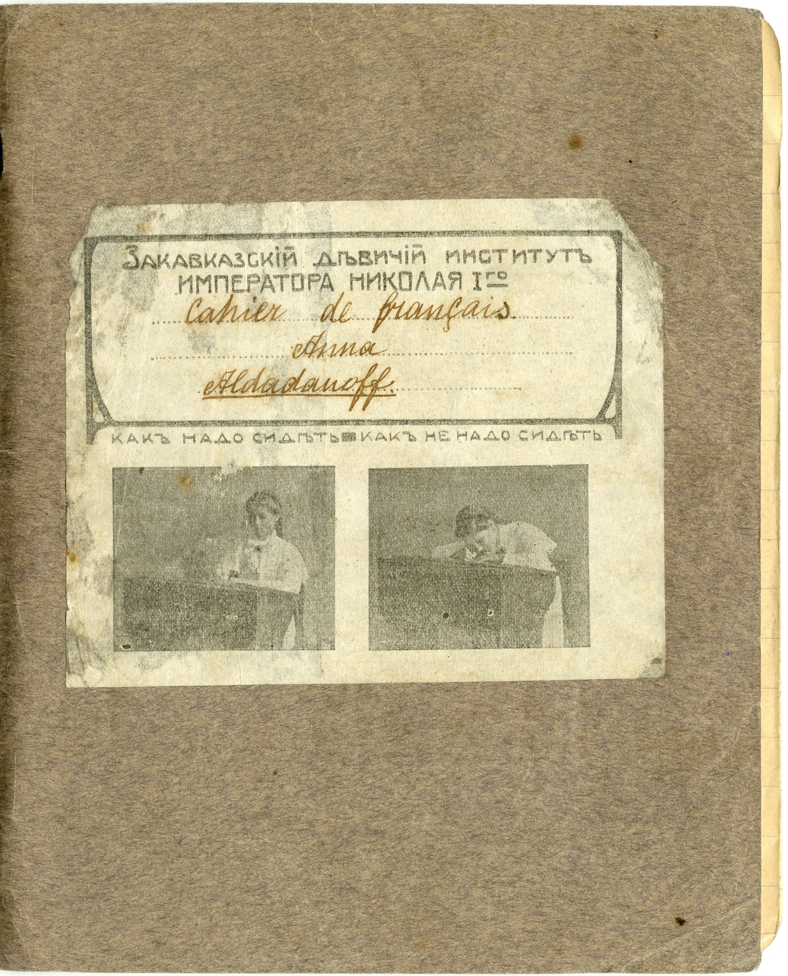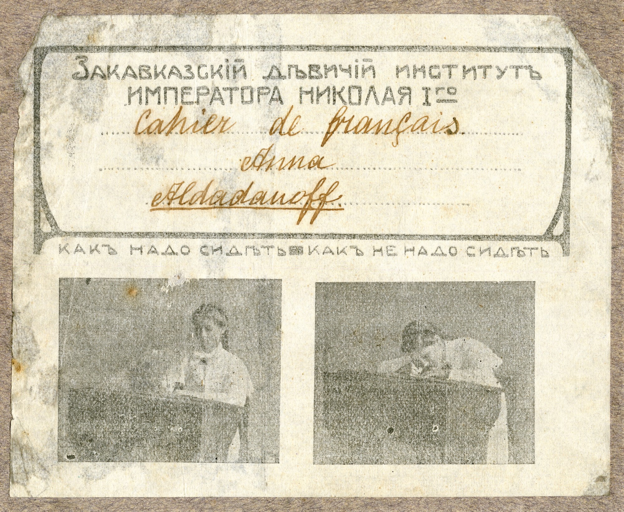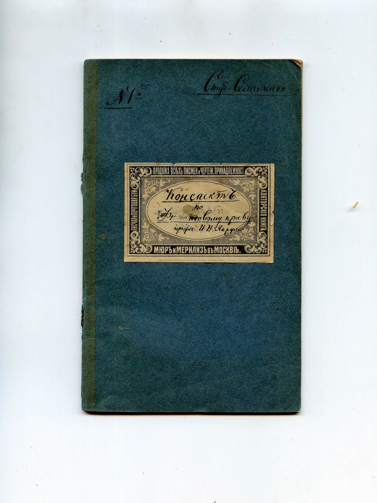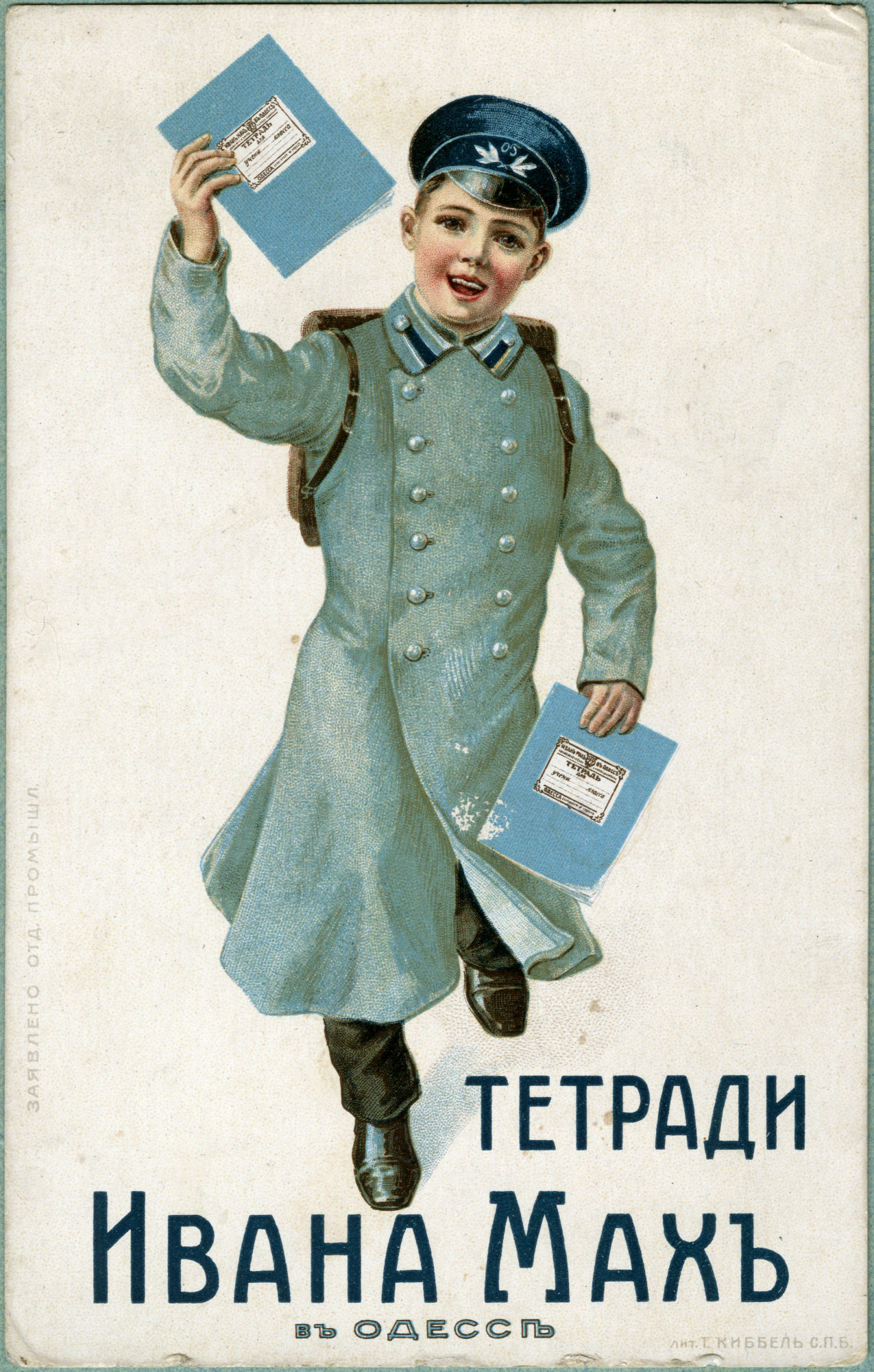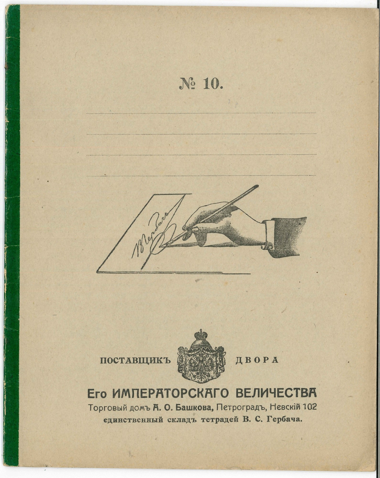 | В любом случае, дореволюционные тетради производили несколько большего формата, чем советские и современные российские. Причина проста, о ней я написал в начале статьи - лист писчего формата, принятого до революции (14 х 17,5 русских дюйма или 35,56 х 44,45 см.) для изготовления тетрадей складывали вчетверо, это и определяло размер самих тетрадей. "Писчий формат" на разных фабриках имел отклонения, обрезали не точно, отсюда и небольшие отклонения в размерах самих тетрадей. Исключения могли быть, но о них позже. Цвет обложки, как правило, был синим, кремовым, желто-коричневым либо зелёным. Скрепление в подавляющем большинстве случаев - строго на двух скобах. Тетрадь с тремя (!!!) скобами встретилась только у Поставщика Двора Его Императорского Величества (подробнее о ней - ниже). Промокашка – обязательна, различных цветов, либо чуть меньшего, чем тетрадь формата, либо и вовсе вполовину от тетради. Предполагаю, что сами пустые «болванки» (то есть тетради без наклеенных на них рамок) печатали где-то централизованно, затем их закупали местные типографии, под заказ печатавшие рамки для различных магазинов, а потом приклеивавшие рамки к «болванкам». Альтернативная версия – «болванки» закупали розничные магазины, размещавшие заказ на рамки в местной типографии и приклеивавшие одну к другой уже у себя. Тем более, что часть магазинов владела собственными, насколько я понимаю, небольшими типо-литографиями. Но были и тетради с безымянными рамками (без упоминания какого-либо магазина), что говорит в пользу первой версии. Возможно обе версии являются верными, а, значит, оба способа производства существовали параллельно. | |||||||||||
