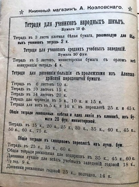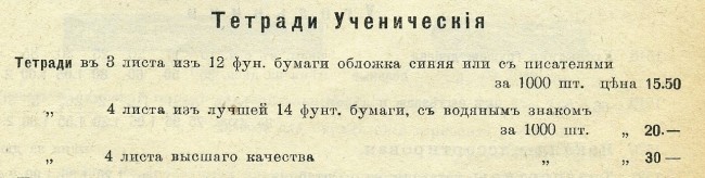 | Также писчебумажными назывались и фабрики, производившие, собственно, писчую бумагу, и писчебумажные товары, то есть, предназначенные для письма. К таким товарам относились и тетради. Позднее места продаж канцелярских товаров стали называться писчебумажными магазинами. Наименование «писчебумажный» в торговле сохранялось весь дореволюционный период, в годы НЭПа и, по всей вероятности, окончательно исчезло из розницы только к середине 30-х годов ХХ в. после выхода постановления партии и правительства "О Школьных письменных принадлежностях", опубликованного в газете "Правда" 15 сентября 1935 г. В рекламных текстах и на вывесках обычно дописывали перечень товаров, которые помимо основной продукции также присутствовали в ассортименте. Термин «канцелярские», тоже часто, но не всегда употреблялся в тексте вывесок и в рекламе, но основой таких магазинов считались всё же «писчебумажные» товары: | |||||||||||
