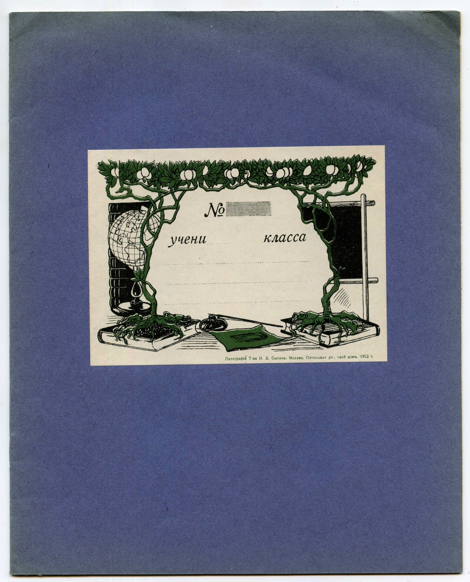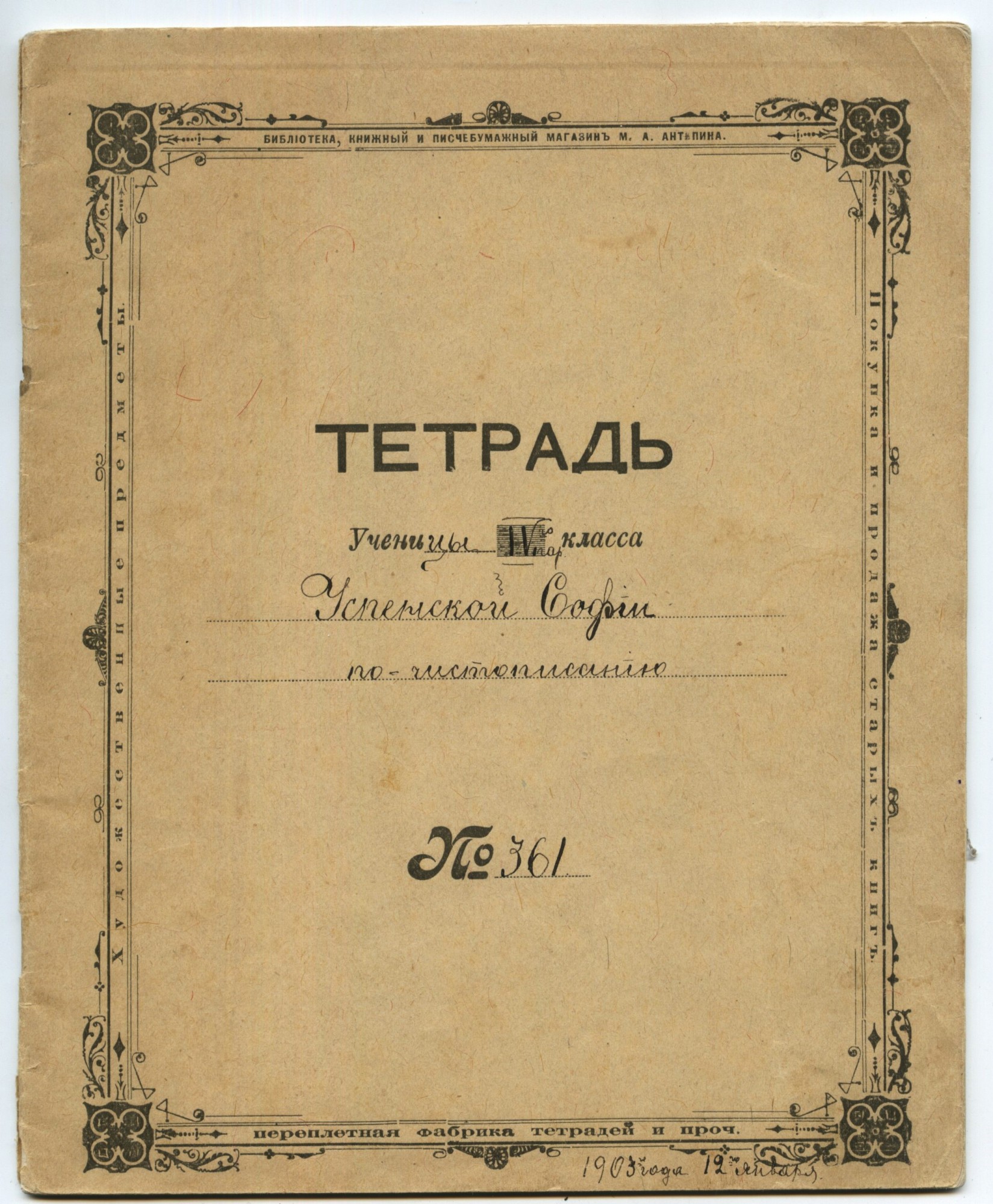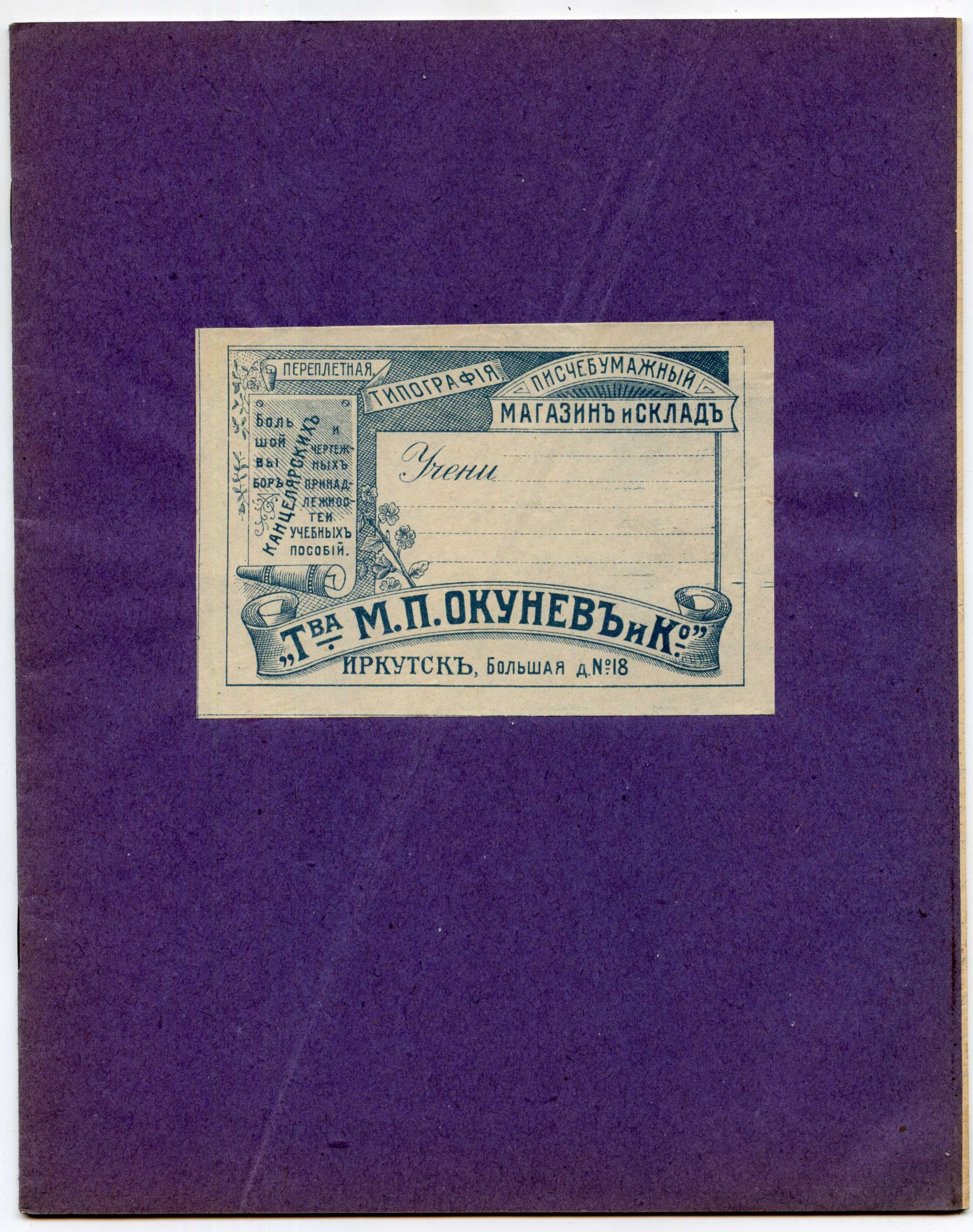 Основной объём тетрадей выпускался писчебумажными (канцелярскими) магазинами, книжными магазинами с большой долей продаж писчебумажной продукции, «складами бумаги» (это предположительно были розничные или полурозничные точки по продаже писчебумажной продукции), а также канцелярскими отделениями (отделами) универсальных магазинов и различными «Торговыми Домами», в которых существовали писчебумажные (канцелярские) отделы. Всех их объединяет принадлежность к канцелярской рознице. Внешне такие тетради, как правило (хотя, были и исключения), представляли собой пустую «болванку» из плотной (от 80-120 гр/кв.м.) крашенной в массе бумаги, с наклеенной на переднюю обложку бумажной рамкой для подписи. Кроме рамки ни спереди, ни сзади, ни изнутри на них ничего не наклеивали и не печатали. На рамках, размеры которых колебались от 9х5 см. до 14х8,5 см. при размерах самой тетради от 170 до 178 мм. по короткой стороне и от 217 до 225 мм. по длинной, обязательно присутствовал рисунок разной художественной ценности (либо просто орнамент), название магазина (часто с рекламными надписями), а также «№» и линовка для подписи. Кстати, что именно нумеровалось, точно неизвестно. Например, что может означать рукописная цифра 361 после «№», как в одной из тетрадей ниже? Номер гимназии? Но в другой тетради №26 (26 – отпечатано типографским способом) – это совершенно точно номер дизайна, так как на №18 этого же производителя, действительно, другой дизайн. Словом, это одна из загадок таких тетрадей. Рамки для удешевления печатались, как правило, в одну или две краски литографским способом, иногда на них мелким шрифтом печатали название типографии (литографии): | |||||||||||