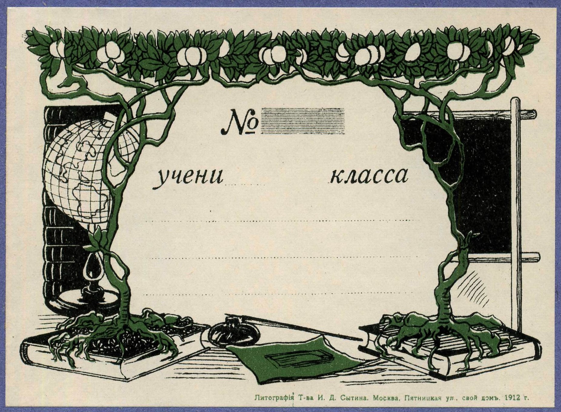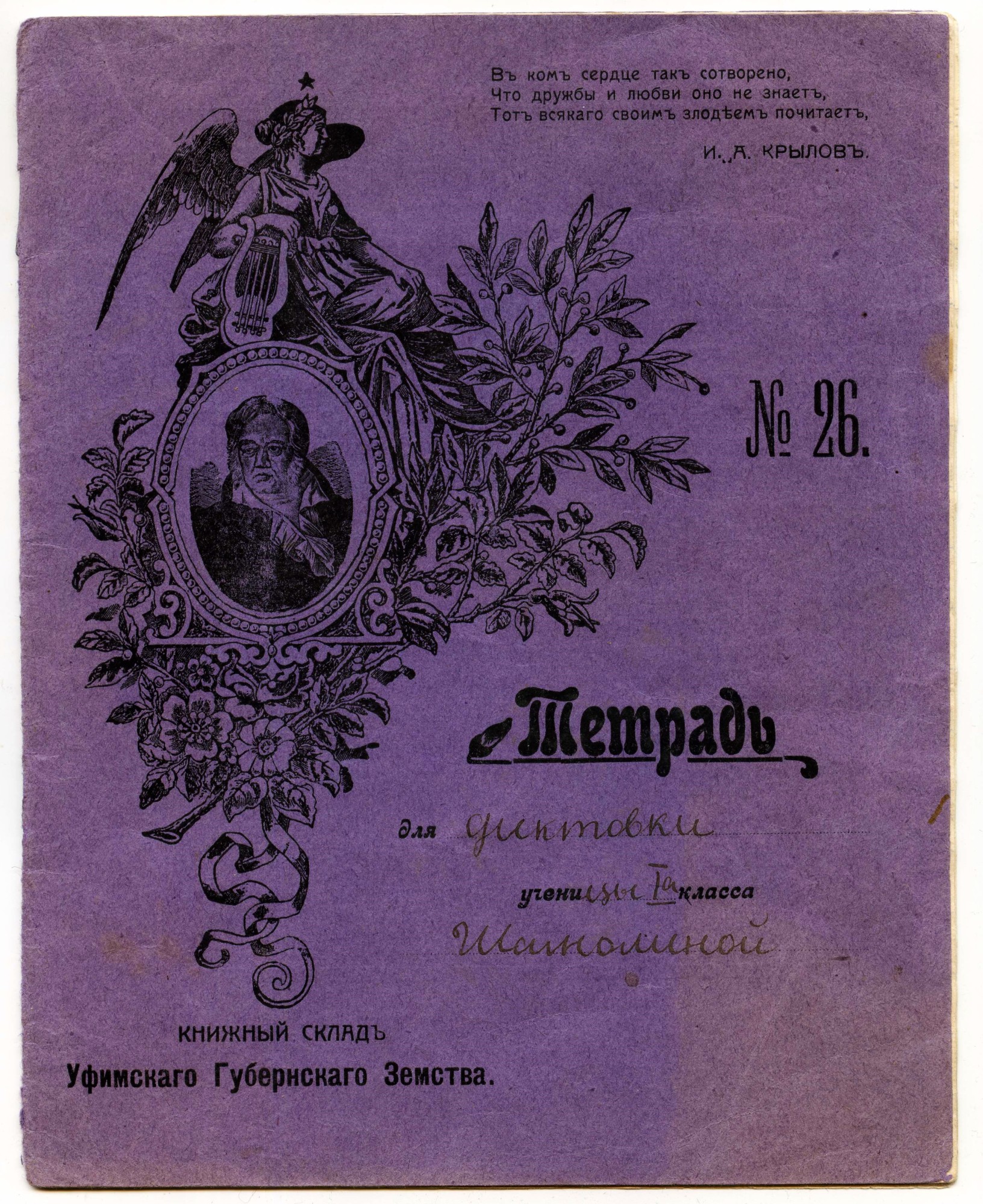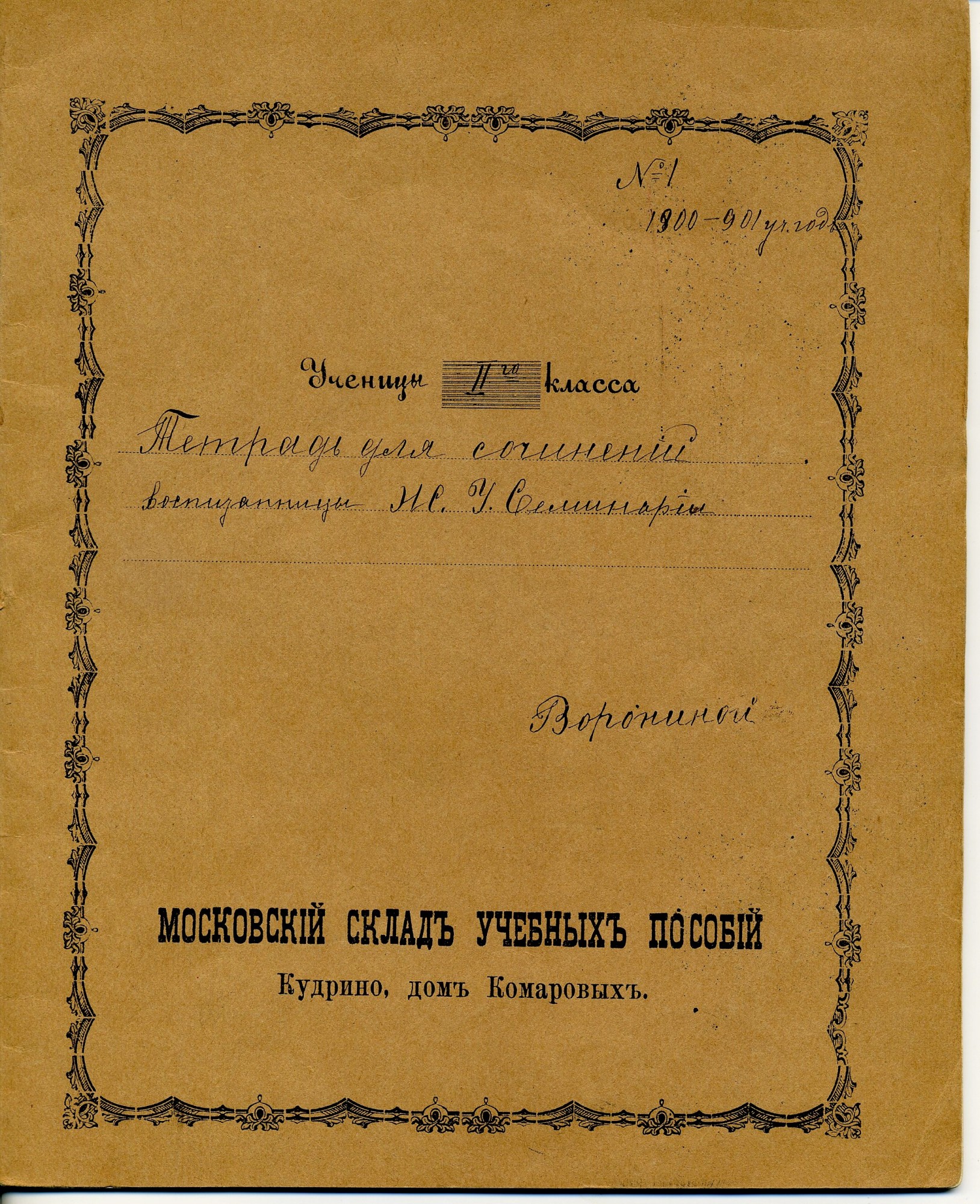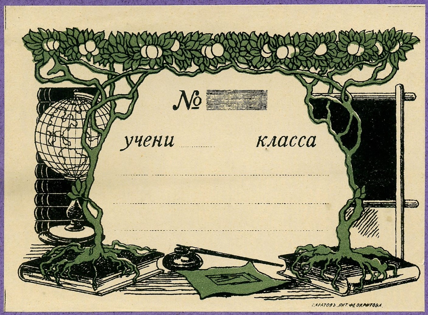 Основной объём тетрадей выпускался писчебумажными (канцелярскими) магазинами, книжными магазинами с большой долей продаж писчебумажной продукции, «складами бумаги» (это предположительно были розничные или полурозничные точки по продаже писчебумажной продукции), а также канцелярскими отделениями (отделами) универсальных магазинов и различными «Торговыми Домами», в которых существовали писчебумажные (канцелярские) отделы. Всех их объединяет принадлежность к канцелярской рознице. Внешне такие тетради, как правило (хотя, были и исключения), представляли собой пустую «болванку» из плотной (от 80-120 гр/кв.м.) крашенной в массе бумаги, с наклеенной на переднюю обложку бумажной рамкой для подписи. Кроме рамки ни спереди, ни сзади, ни изнутри на них ничего не наклеивали и не печатали. На рамках, размеры которых колебались от 9х5 см. до 14х8,5 см. при размерах самой тетради от 170 до 178 мм. по короткой стороне и от 217 до 225 мм. по длинной, обязательно присутствовал рисунок разной художественной ценности (либо просто орнамент), название магазина (часто с рекламными надписями), а также «№» и линовка для подписи. Кстати, что именно нумеровалось, точно неизвестно. Например, что может означать рукописная цифра 361 после «№», как в одной из тетрадей ниже? Номер гимназии? Но в другой тетради №26 (26 – отпечатано типографским способом) – это совершенно точно номер дизайна, так как на №18 этого же производителя, действительно, другой дизайн. Словом, это одна из загадок таких тетрадей. Рамки для удешевления печатались, как правило, в одну или две краски литографским способом, иногда на них мелким шрифтом печатали название типографии (литографии): | |||||||||||