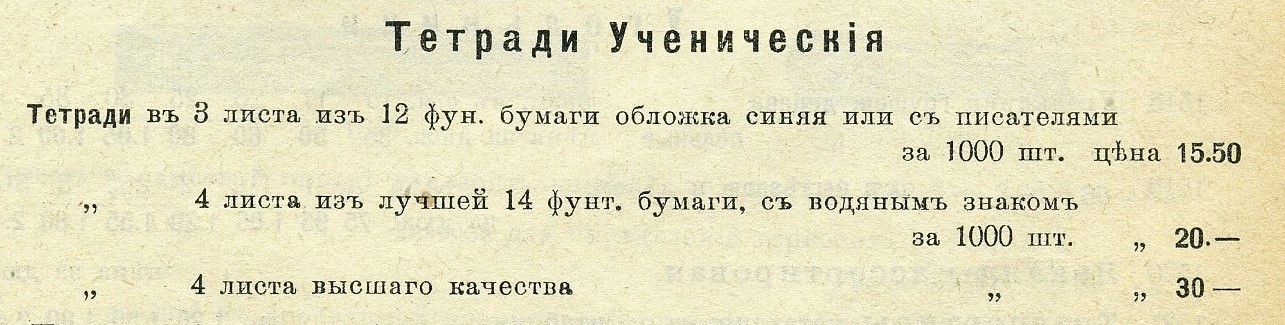 По отношению к тетрадям употребляли слово «ученические» и «общие». Термин «школьная тетрадь» ни в прейс-курантах, ни в рекламе, ни на самих тетрадях не встречался. Листность, как я уже упоминал в начале статьи, измерялась в листах писчего формата, из которых была изготовлена тетрадь, сложенных в четверо, а не в количестве листов формата уже готовой тетради . В прейс-курантах, можно было увидеть «тетради для учеников», например, «в 3 листа» или «в 5 листов», а «тетради для рисования» (отличие тетради для рисования от альбома - в рамке для подписи на обложке): «в 6», «в 10», и «в 14 листов». Всё это - применительно к тетрадям в бумажной обложке. Общие тетради производили только в твёрдом переплёте. В нашем музее выложена, например, 92-листная тетрадь Неманской фабрики (г. Гродно) 1900 г. в книжном тканевом переплёте с надписью «Общая» на обложке. Плотность бумаги измеряли в русских фунтах на стопу. Применительно к изделиям из бумаги не оперировали современным понятием «плотность». Говоря о плотности бумаги, её называли 12-ти фунтовой, 14-ти фунтовой и т.д. Подробнее об этом во второй части. Поля были и в цвет линовки и красные, у части тетрадей они присутствовали, у части – нет. | |||||||||||