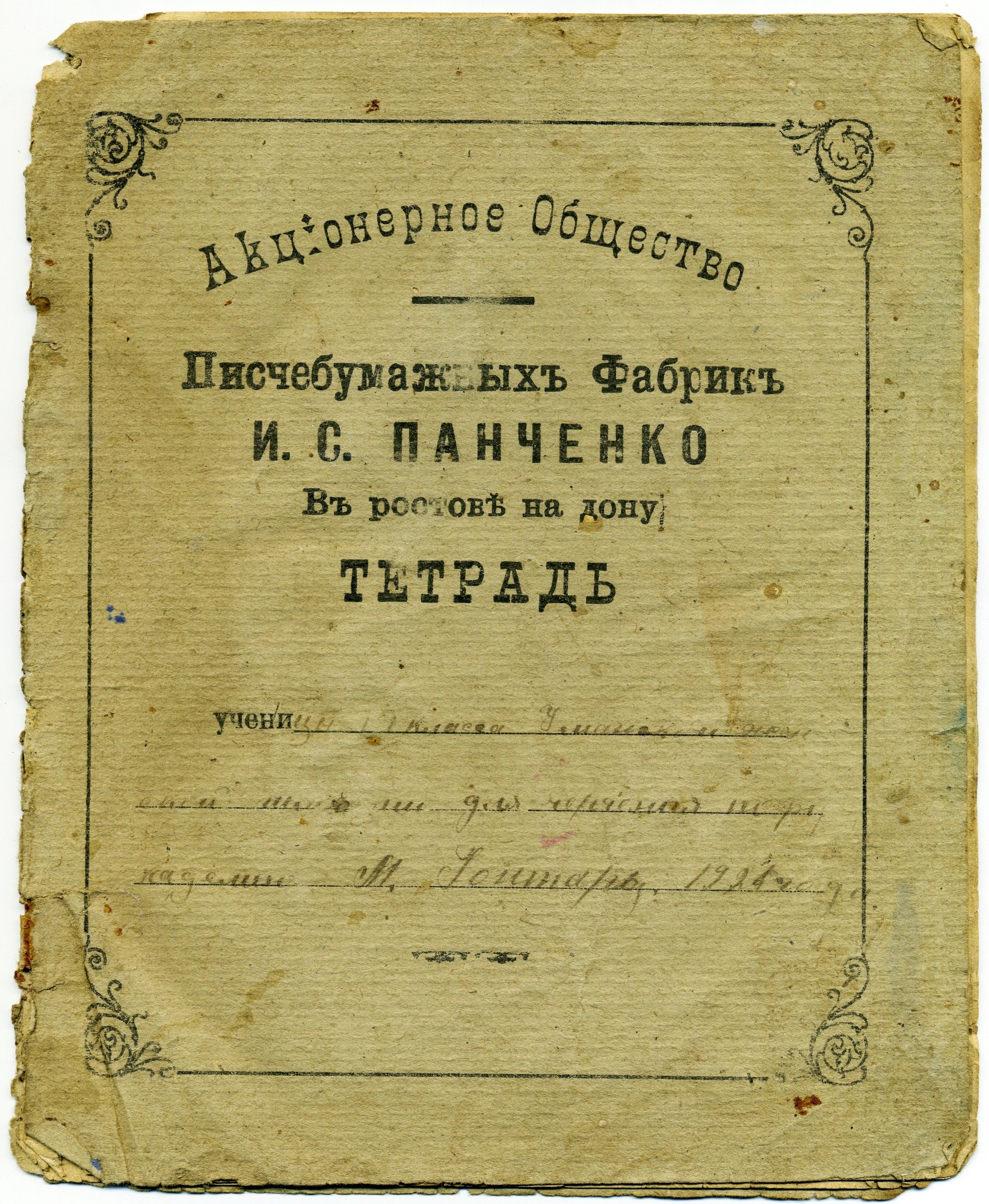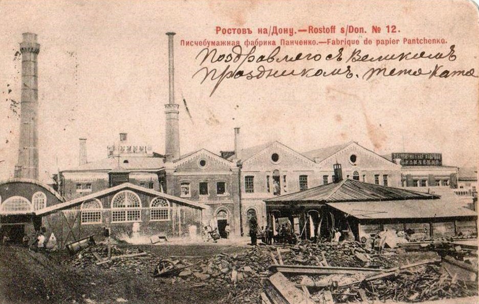 Продолжая классификацию тетрадей по производителю (издателю), необходимо отметить, что существенную долю объёма в общем их производстве занимали сами писчебумажные фабрики. Речь, во-первых, идёт о том, что они указывали на лицевой стороне крупным шрифтом свои выходные данные, а во-вторых, скорее всего, именно они и производили те самые «пустые болванки» для тетрадей, которые впоследствии персонализировали писчебумажные магазины. Писчебумажные фабрики производили писчую, почтовую и другую бумагу и у них должно было стоять линовальное оборудование необходимое для производства тетрадей Ниже - тетрадь «Акционерного общества писчебумажных фабрик И. С. Панченко», находившегося в Ростове на Дону. К концу Х1Х в. фабрики Панченко вырабатывали 150 000 пудов бумаги в год, что для того времени составляло значительный объём. Справа – внешний вид фабрики с открытого письма. | |||||||||||
