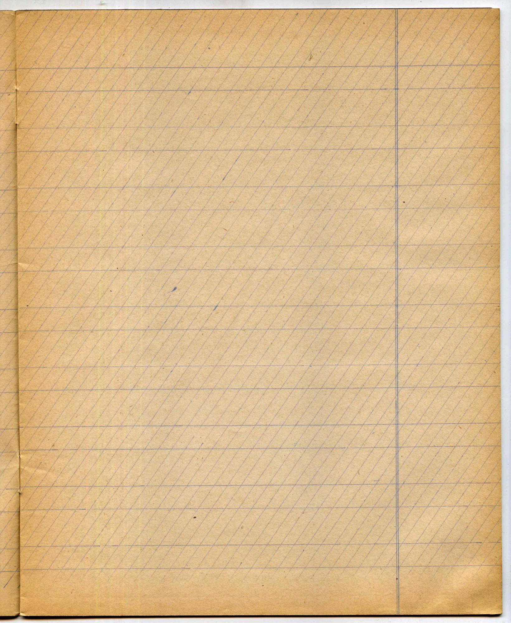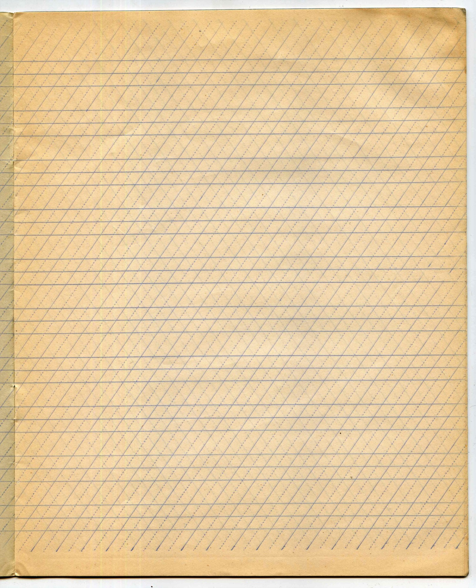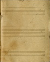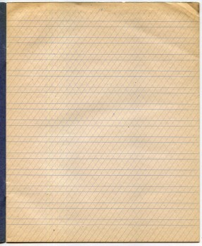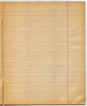 | Ниже - ещё одна линовка, назначение которой для меня так и осталось загадкой. Стандартный угол наклона косых линий в тетрадях - 65 градусов, но здесь угол более пологий... попробуйте под этим наклоном что-либо написать! Да и всего одна косая линия на страницу - тоже весьма не стандартное решение. Эта тетрадь из одесского магазина Ивана Маха. | |||||||||||