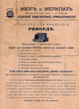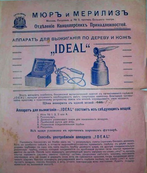 | Фотографии «рядов» - из альбома «Москва. Городские ряды» (М. 1890) Н.А. Найдёнова, возглавлявшего думскую комиссию по их перестройке и фиксировавшего виды фасадов, вывесок и внутренних помещений незадолго до их ликвидации и постройки существующего ныне здания ГУМа. Обратите внимание - всё свободное пространство фасада магазины пытались занять рекламой. Конкуренция была жёсткой и писчебумажные магазины конкурентов могли располагаться в соседних зданиях. Взгляните снова на фото магазина Ивана Жукова! Слева, вплотную от него, расположился один из писчебумажных магазинов Простакова. Рекламную визитку его наследников я дал выше, а прейскурант его магазина на Тверской улице отсканирован и полностью выложен в нашем «Отраслевом канцелярском музее». «Конторские товары» иногда именовались «кабинетными вещами». Этот термин можно увидеть в Прейскуранте всё того же Простакова. В современной терминологии всё это – офисные товары. В этом смысле к «конторским товарам» относилась также писчая и почтовая бумага, хотя в рекламе её часто выносили отдельно, ввиду её особого значения для бесперебойной работы контор (по аналогии с современной форматной бумагой), в том числе, и в рекламе писчебумажных магазинов на тетрадях. Но одновременно бумага являлась и писчебумажной продукцией. Исходя из того, что наши предки и предшественники путались в терминологии не меньше, чем наши современники, то и мы в рамках этого материала можем позволить себе вольное употребление слов «канцелярский» и «писчебумажный» по отношению к дореволюционной рознице, в зависимости от контекста. Писчебумажные и канцелярские товары продавались также в различных «торговых домах», то есть в магазинах, торгующих смешанным ассортиментом. Существовали «отделения канцелярских принадлежностей» во вновь открываемых «универсальных магазинах», например, в «Мюр и Мерилиз», в том самом магазине на Петровке, который в 20-е годы был переименован в «Мосторг», а затем в «ЦУМ». В том, про который бабушки даже в 40-х и 50-х говорили: «пойдём к Мюру». Упомянув «Мюр и Мерилиз», не могу тут не разместить страницу из их прейс-куранта. Примечательно, что выжигательные аппараты и в то время продавались в канцелярских отделах:.