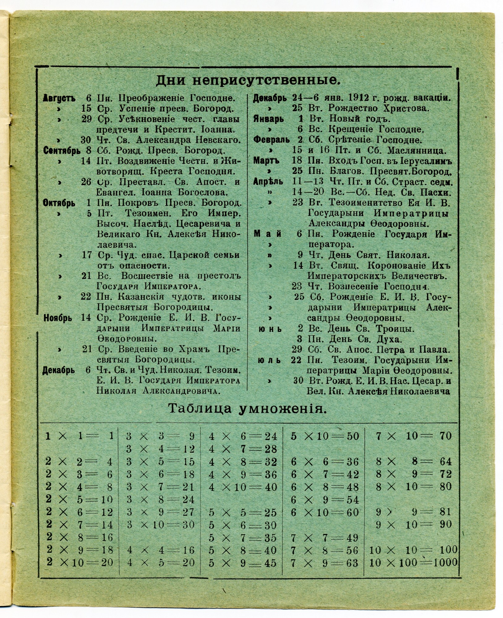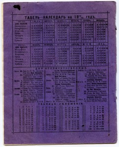 Ещё об одном, но скорее даже правиле, а не исключении. До революции практивовались два способа изготовления тетрадей. Часть магазинов выпускала «персонализированные» тетради не с наклеенной на «болванку» рамкой для подписи, а с печатью по обложке (спереди и сзади), а некоторые и по форзацу. Вероятно у этих магазинов был большой оборот, а возможно, они представляли собой розничную сеть, так как такой способ производства предполагает большие тиражи. В дореволюционных тетрадях ни тираж, ни цена, к сожалению, не указывались. Кстати, почему тот же Сытин наряду с полноценной запечатанной обложкой производил тетради и с рамкой, приклеенной к пустой «болванке», также непонятно. Ведь к 1917 году Иван Дмитриевич имел четыре магазина в Москве, два — в Петрограде, а также магазины в Киеве, Одессе, Харькове, Екатеринбурге, Воронеже, Ростове на Дону, Иркутске, Саратове, Самаре, Нижнем Новгороде, в Варшаве и Софии (совместно с Сувориным). К тому же, торговал ещё и оптом. А значит, тиражи должны были быть не маленькие, да и производственные мощности его «книжной империи» позволяли. Ниже – фото других подобных тетрадей с печатью по обложке, но уже с информационной, если так можно выразиться, нагрузкой, выпущенных уже канцелярскими магазинами. У одной запечатаны первая и задняя обложка, а также форзацы. На форзацах присутствует справочная информация, кроме того, тетрадь «датированная» (в современной терминологии), то есть, с календарём. У другой запечатана только обложка. | |||||||||||