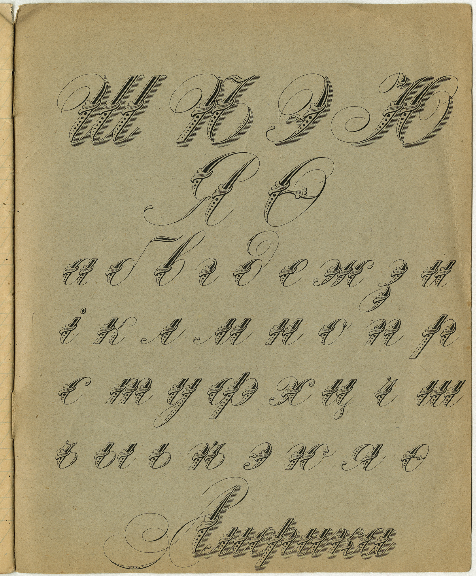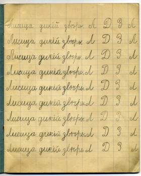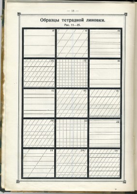 | Ниже ещё две «линевки». Слева – единственный вид «линевки», с идентификацией которого не возникло абсолютно никаких проблем. Это №1 (белая). В ней, видимо, писали через трафарет. А вот справа, либо не указанный в нашем перечне вид линовки, либо одна из загадочных «немецких» (№12 или №13). Единственное, что можно утверждать совершенно точно, что в российской дореволюционной школе существовало прямое и наклонное письмо. А эта «линевка» как раз для прямого письма.