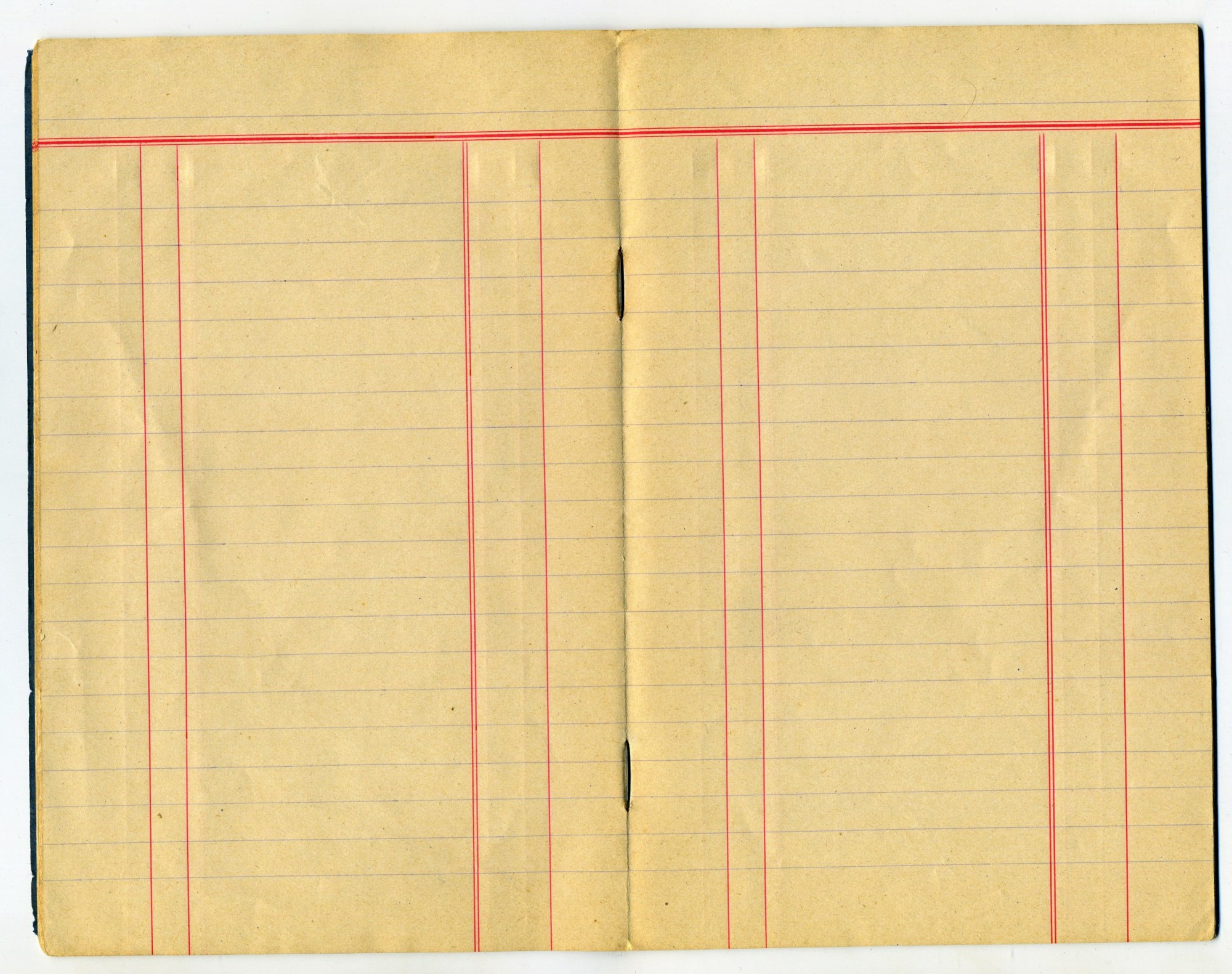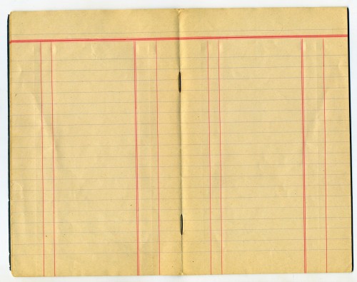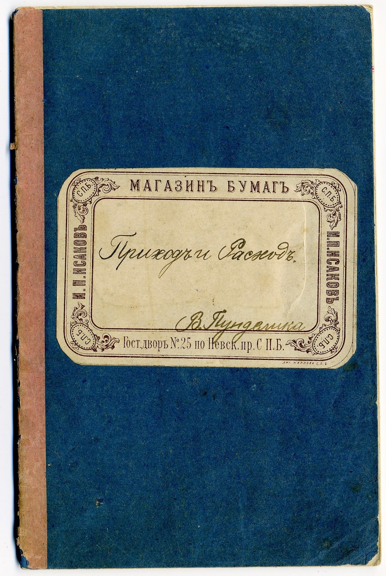 | У меня поначалу не было никаких версий о причинах такого странного технического решения, пока я не повстречал тетрадь, представленную ниже. Она также, как и одна из тех, что выше, приблизительно А6 формата, но с линовкой для прихода и расхода, то есть, фактически это канцелярская книга карманного формата. Версия следующая - в дореволюционных тетрадях скобы загибали снаружи обложки, а не внутри блока, а потом заклеивали корешок (то есть, вместе со скобами) бумажной лентой, чтобы дети не подменяли листы. То есть, получается, что лист вынуть можно, а вставить, не нарушив наружную обклейку бумажной лены невозможно. По-видимому, в приходно-расходной книге это делалось для сохранения финансовой отчетности, а в школьной тетради - для сохранения оценок и ошибок. Впрочем, я не претендую на истину в последней инстанции, это, всего лишь, версия. Кстати, рамка опять скруглена, как у всех питерских. | |||||||||||
