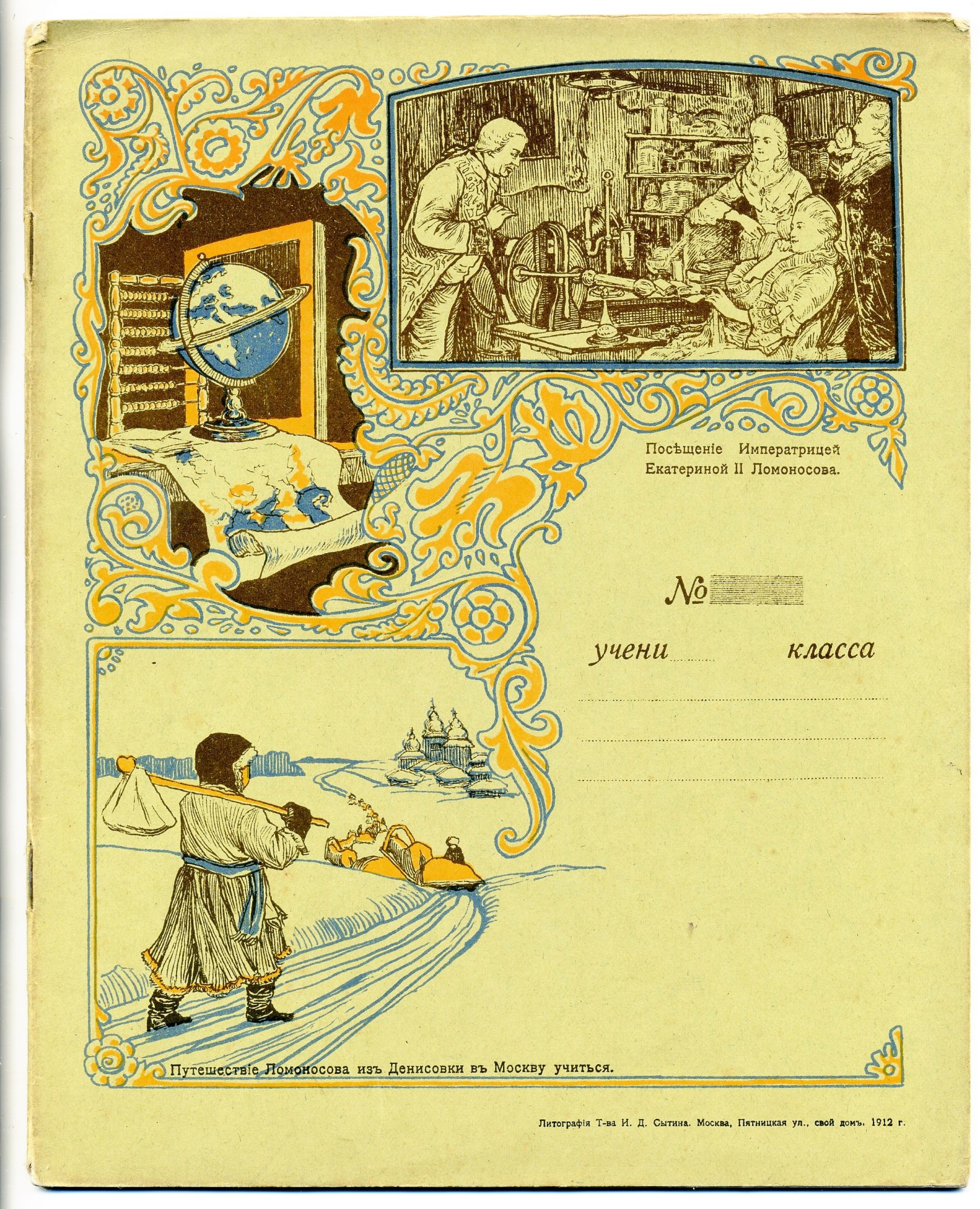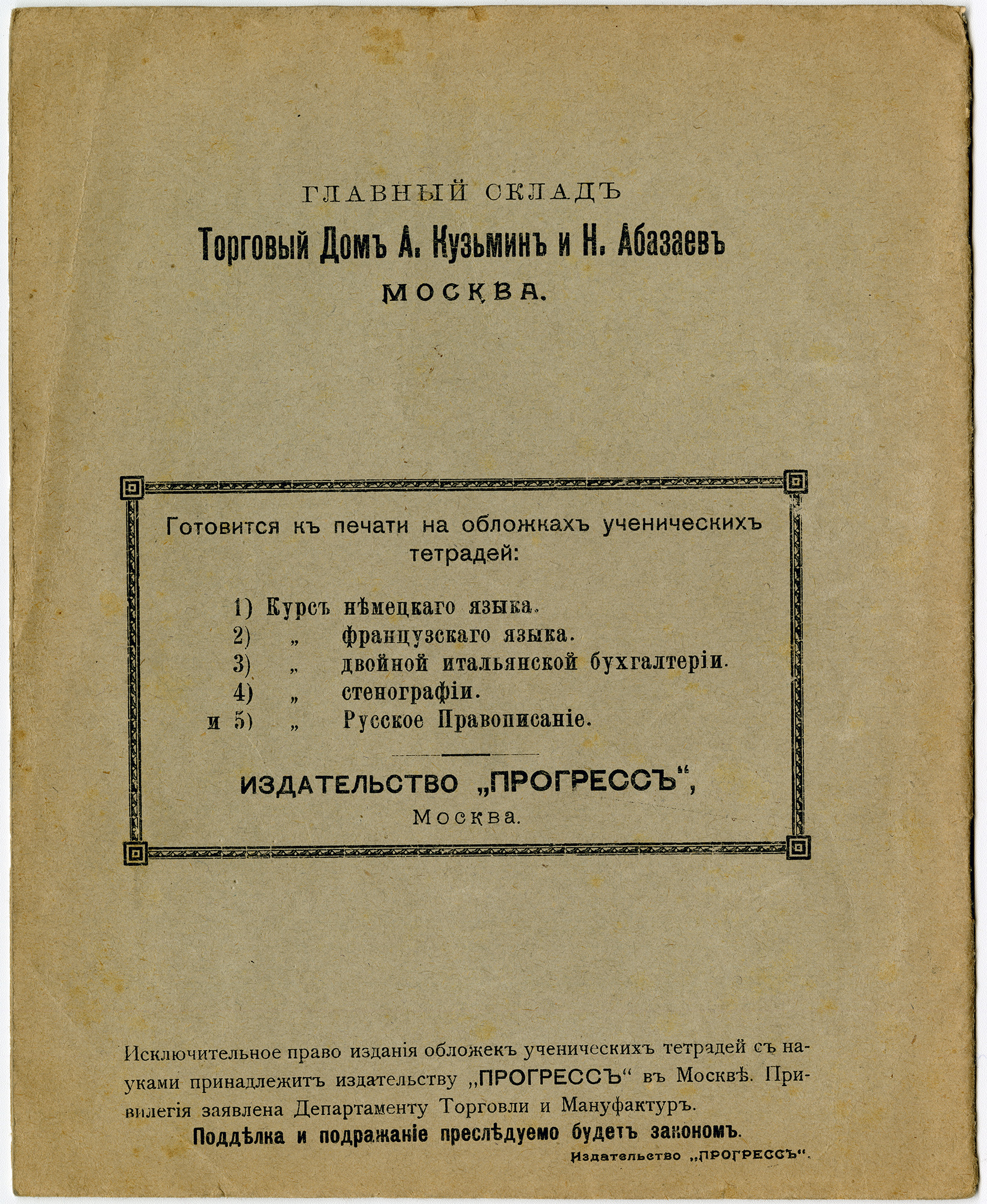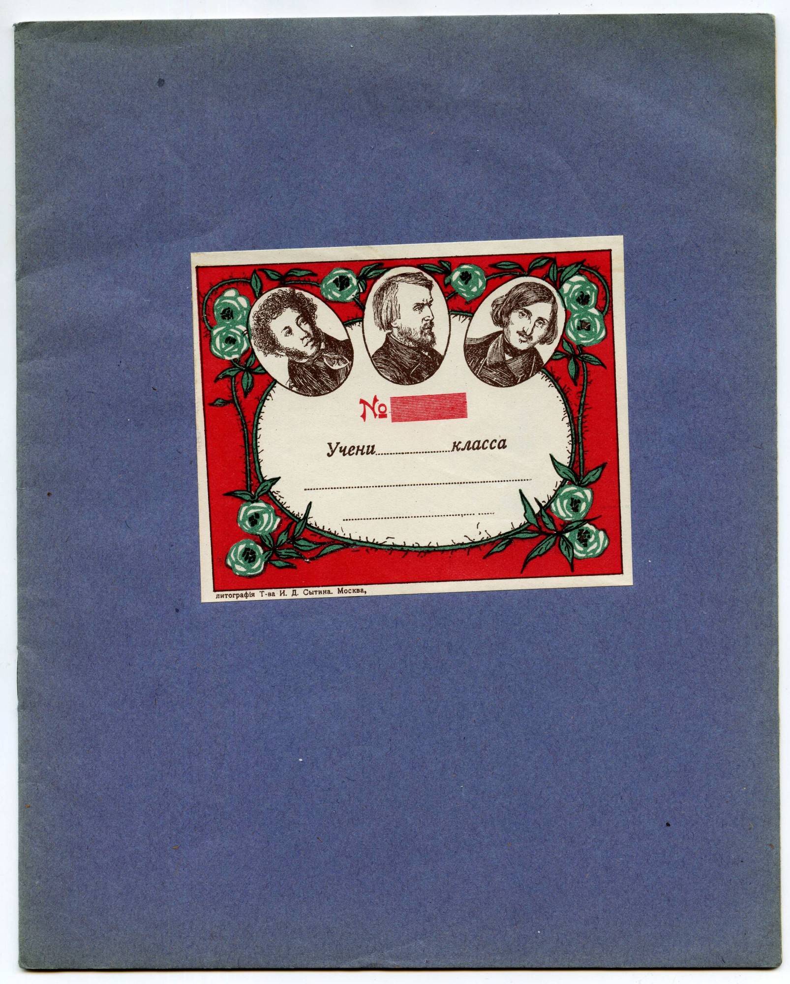 | Сложно понять причины, по которым тут изображены верблюды, а у вдовы Васильева – корабли, видимо, это было делом купеческого вкуса. По поводу геральдики московских торговых знаков версий также может быть достаточно. Теперь об исключениях. Первое и не до конца понятное – зачем крупнейший книгоиздатель Российской Империи Иван Дмитриевич Сытин производил фактически безымянные тетради (и с наклеенной на «болванку» рамкой, и полностью запечатывая обложку), указывая в лишь мелким шрифтом снизу свои выходные данные (в обоих вариантах)? Почему он, имея широкую и разветвлённую сеть книжных магазинов, не давал их рекламу крупным шрифтом в центре или вверху рамки, как все остальные, но не столь успешные предприниматели? У меня объяснение одно – таким образом, он не отсекал оптовых покупателей. Но возможно, найдётся и другое объяснение данному факту.