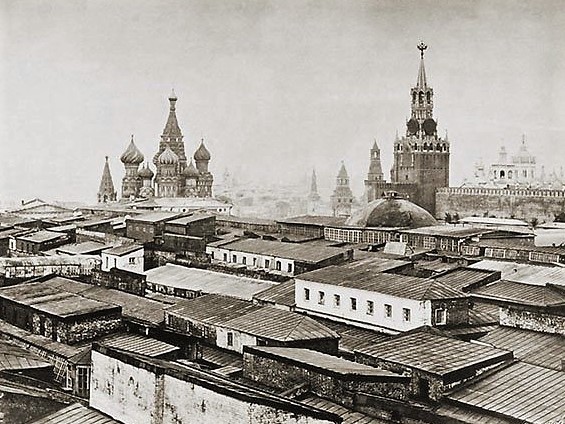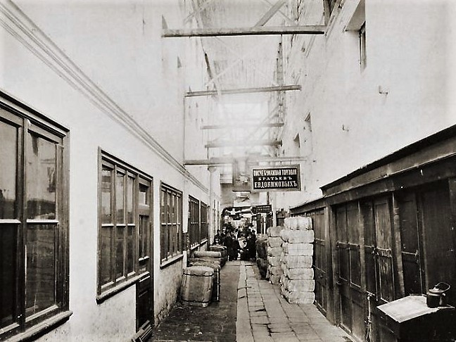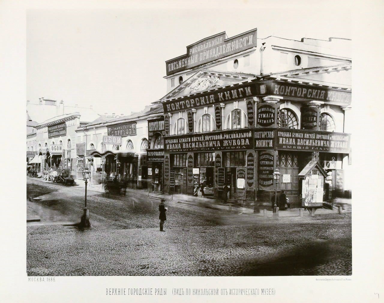 | Кроме того, до революции, как и сегодня, «конторские» товары соседствовали со школьными и художественными в одном магазине, что хорошо видно на примере магазина Ивана Васильевича Жукова на Никольской улице в Москве (верхнее левое фото). На его вывеске присутствуют конторские книги, рисовальная бумага и ватман. Кстати, если судить по месторасположению, то это был чуть ли не главный канцелярский магазин империи. Присмотритесь внимательно к фотографии – перед магазином брусчатка Красной площади. Если представить, что мы стоим на месте съёмки в наше время, то сзади нас кремлёвская стена, слева исторический музей, а справа Покровский Собор. Никольская улица идёт прямо от нас, а на месте этого магазина теперь ГУМ. Ну и раз уж коснулись темы московских «Верхних торговых рядов», то вот так неприглядно они выглядели сверху (нижнее левое фото). Не правда ли, чем-то напоминает «Черкизон» наших 90-х?. На правом фото - торговые помещения и склады внутри рядов – «Писчебумажная торговля братьев Евдокимовых». | |||||||||||