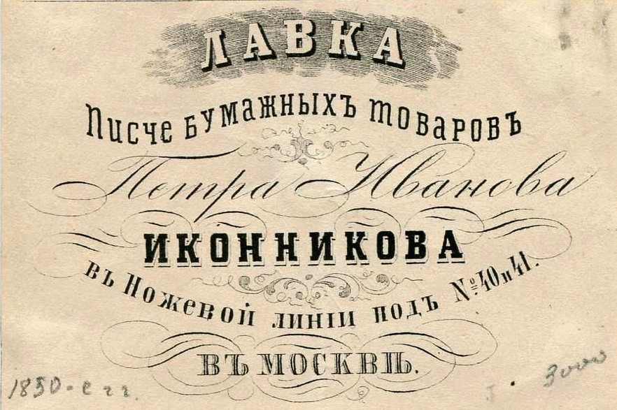 Розничные точки, торгующие канцелярскими товарами, например, в середине XIX века именовались лавками, а сами товары – писчебумажными. Ниже – реклама такой лавки в «Верхних торговых рядах» в Москве, находившихся на месте нынешнего ГУМа и просуществовавших до конца 1880-х годов. Эта рекламная визитка датируется 1850-ми годами. Скорее всего, писчебумажная продукция являлась основой ассортимента, но продавали в такой рознице и сопутствующие товары, в нашем понимании - канцелярские. | |||||||||||
