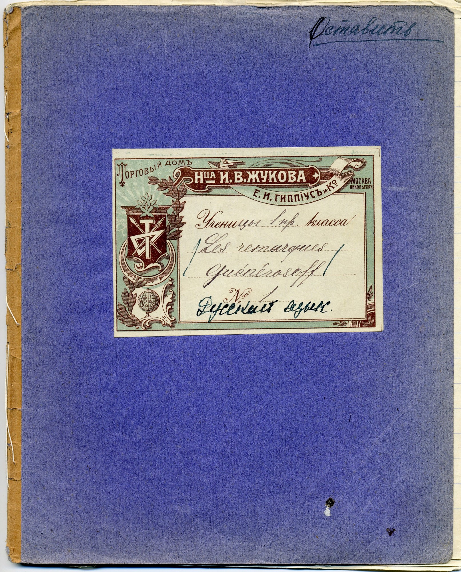 Возможно, таких было много, но судя по всему, «именных», всё-таки, подавляющее большинство. Имя и его история ценились чрезвычайно высоко. Приглядитесь, хотя бы к фотографии уже не раз упомянутого нами магазина Жукова на углу Никольской и Красной площади (фото см. выше) – там под вывеской «Ивана Васильевича Жукова» написано: «Бывший Глазунова». Мы не знаем, родственники ли они, но всё это несомненно указывает на преемственность истории магазина и имени. Более того, эту историю отображали и на тетрадях. В тетради наследницы того же Жукова – Евгении Ивановны Гиппиус так и написано: «Н-ца И.В. Жукова», а в тетради наследницы некоего купца Васильева написано: «Писчебумажный склад В-вы И.И. Васильева». Интересно, что не указано имя вдовы. | |||||||||||