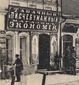 | Подавляющее большинство магазинов называлось по фамилии владельца, что обязательно отражалось в рамке для подписи на тетрадях, хотя были исключения – например, магазин «Труд» в Царицыне» или «Экономия» в г. Карачев Орловской губернии (его фото с открытого письма см. выше) или вот такой магазин «Просвещение» в Харькове: | |||||||||||