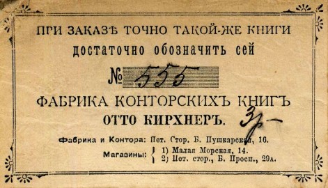 | Само слово «писчебумажный» писалось, как слитно, так и раздельно, а также через дефис. В дореволюционный период, как и сегодня, существовало терминологическое разнообразие. К канцелярским товарам (принадлежностям) могли относить и всю писчебумажную продукцию, включая тетради, не выделяя её отдельно, но могли отдельно указывать, что в продаже имеется писчая и почтовая бумага, а также тетради. На прилавке каждого уважающего себя писчебумажного магазина обязаны были присутствовать конторские книги. Более того, некоторые, и весьма крупные, типографии или их подразделения так и именовали себя – «фабрика конторских книг», хотя производили широкий ассортимент продукции из бумаги, например, фабрика Отто Кирхнера в Санкт-Петербурге, ставшая после национализации в 1918 г. «фабрикой Светоч». Конторские книги являлись основой ассортимента магазинов, обслуживавших «конторы» (офисы в современном понимании этого термина) и зачастую выносились в центр рекламного пространства на фасадах магазинов. | |||||||||||