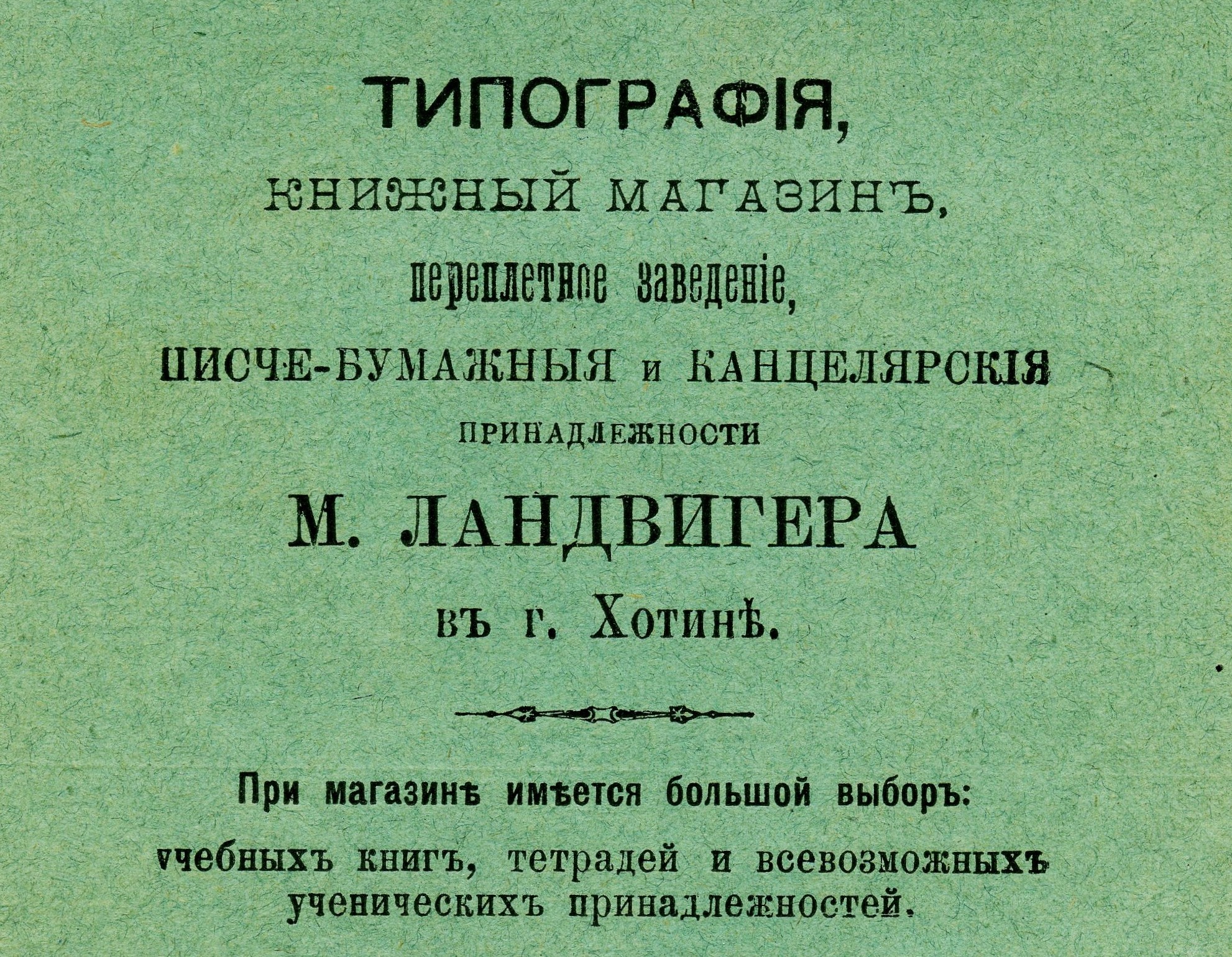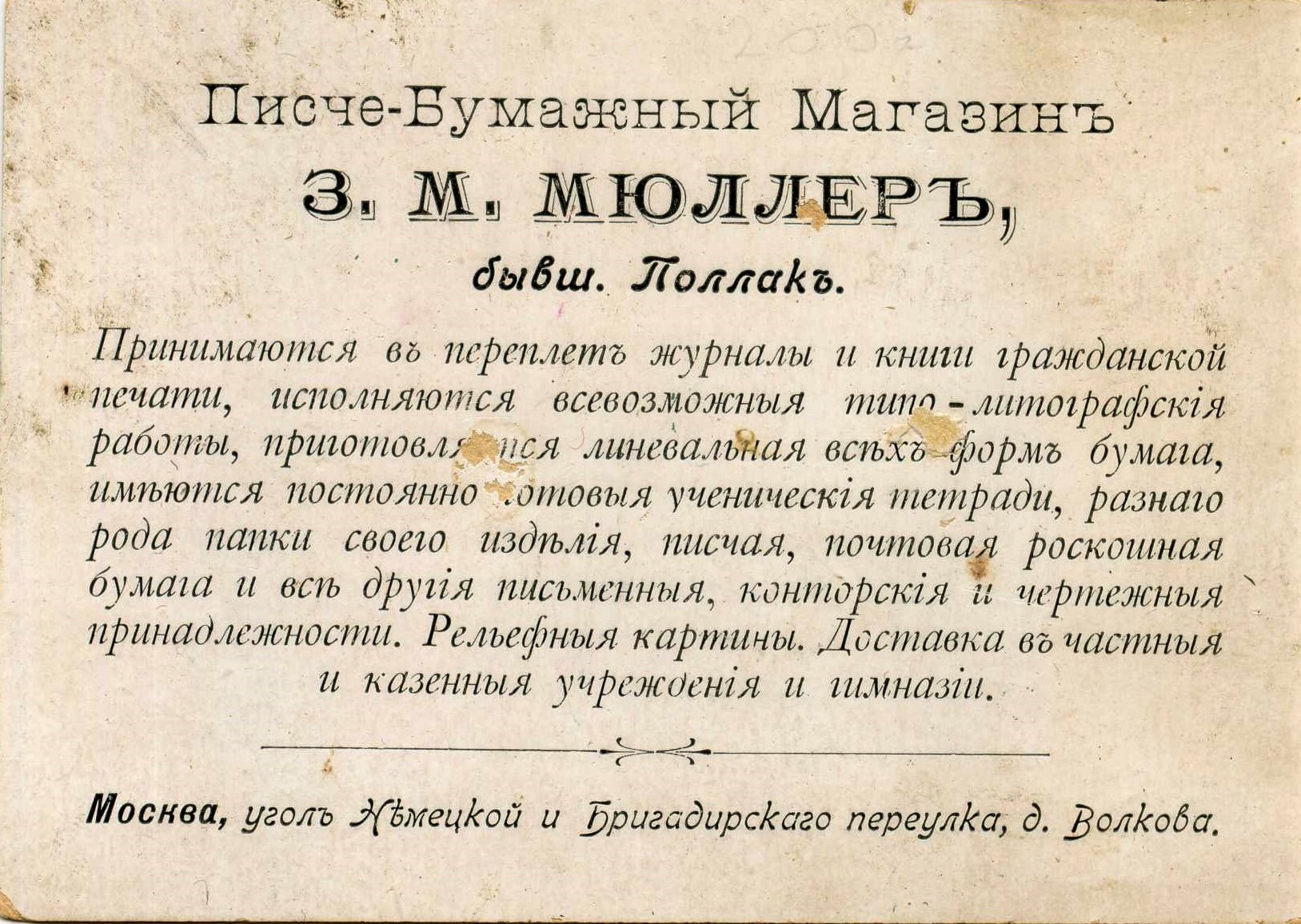 | В качестве ещё одного примера галантерейно-канцелярского бизнеса будет очень любопытно посмотреть оптовый илюстрированный прейскурант Кульварского в отраслевом музее. Все опубликованные мной выше фотографии, взяты с «открытых писем» (открыток), которые также были частью ассортимента писчебумажных магазинов, владельцы которых зачастую являлись одновременно и издателями, а в качестве городских видовых изображений нередко использовали фото собственных магазинов, особенно, если те располагались на центральных улицах. Часто розничный писчебумажный бизнес сопровождала собственная типография (лито-типография): | |||||||||||