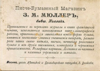 Последнее фото, которое я хочу здесь привести, говорит о том, что и до революции тетради рекламировали. Само по себе ничего не продавалось. Это - рекламная карточка (картон) Торгового Дома всё того же Ивана Маха из коллекции одного московского коллекционера, её размер 88 Х 138 мм. Скорее всего она вкладывалась в заказы магазина, отправляемые по почте или с курьером. | |||||||||||