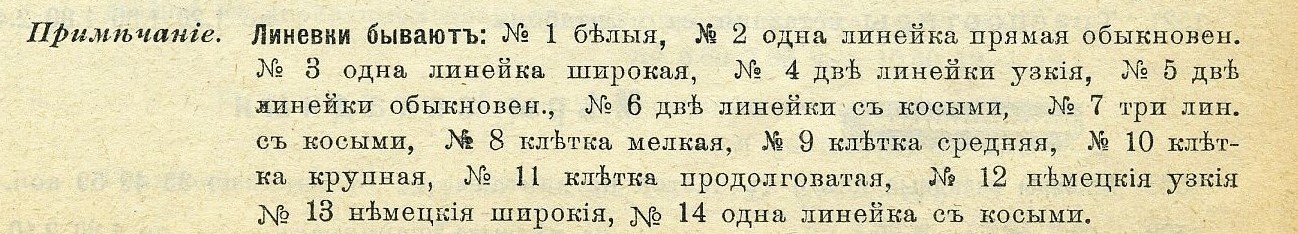 | Линовка мне встречалась по большей части синего цвета (возможно, голубая или фиолетовая – из-за выцветшей от времени краски понять сложно), но попадалась и серого. С видами линовок ненамного понятнее. Вместо слова линовка, писали «линевка». А тетрадь, как и некоторые виды писчей бумаги, была не линованая, а «линеваная». Сами «линевки» по названию делились на следующие: | |||||||||||