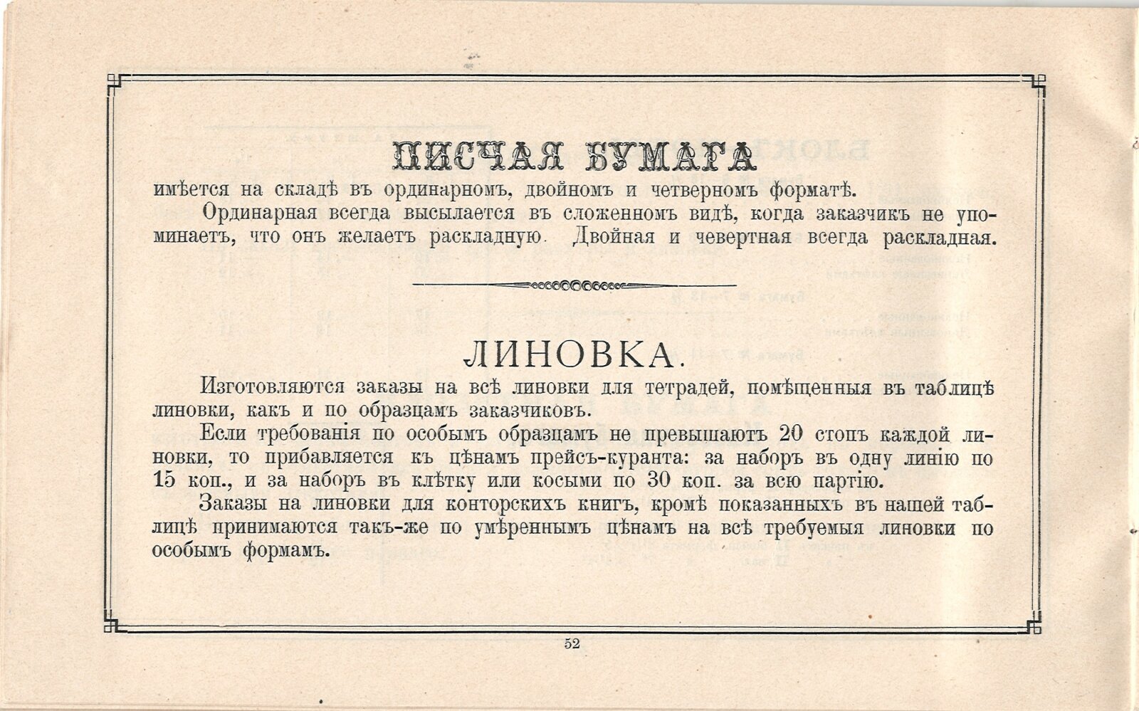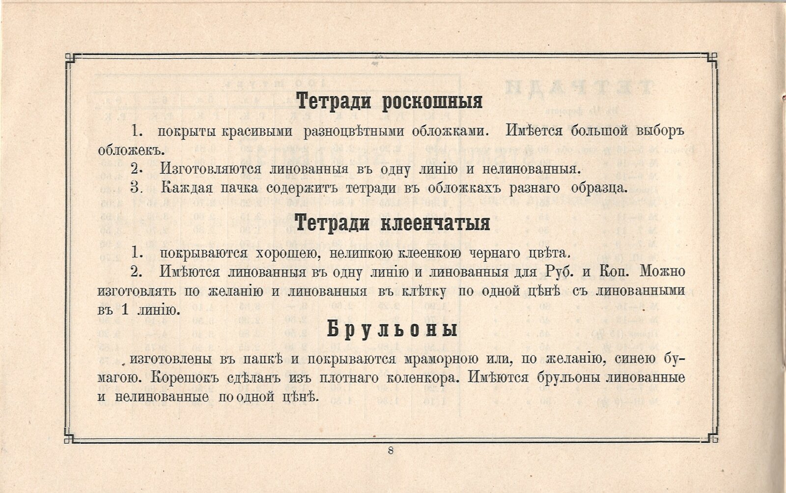 Всё это также означает, что у писчебумажной фабрики Паллизен существовал отдельный и, судя по всему, хорошо выстроенный тетрадный бизнес с продуманной ассортиментной и торговой политикой, как это показалось мне вначале. Как мы видим, линовали не только тетради, но и конторские книги, почтовую бумагу, да и мало ли ещё что. Это была фабрика по производству настоящего «бумбела», то есть бумажных товаров со всевозможными линовками для письма. Линовали всё, не только сложные изделия, но и писчую и почтовую бумагу.Линовали в основном классическими «голубыми линиями» (прямая цитата из Прейс-Куранта), но почтовую бумагу – «светло-серыми». Как всё схоже с днём сегодняшним, хотя и в советское время, и сейчас не обходится без экспериментов.