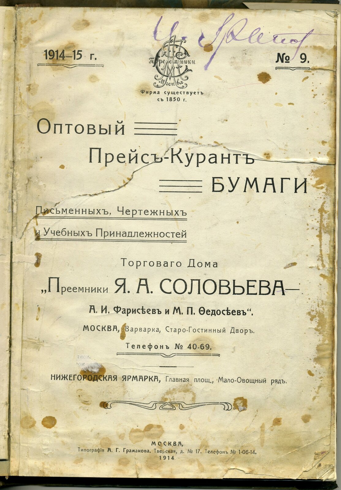 Прейс-Курант «Преемники Торгового Дома Я.А. Соловьева», 1914 г. Отраслевой канцелярский музей.
