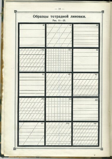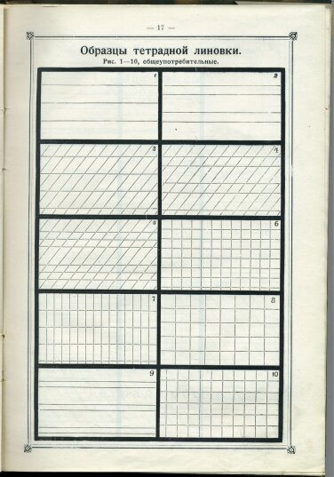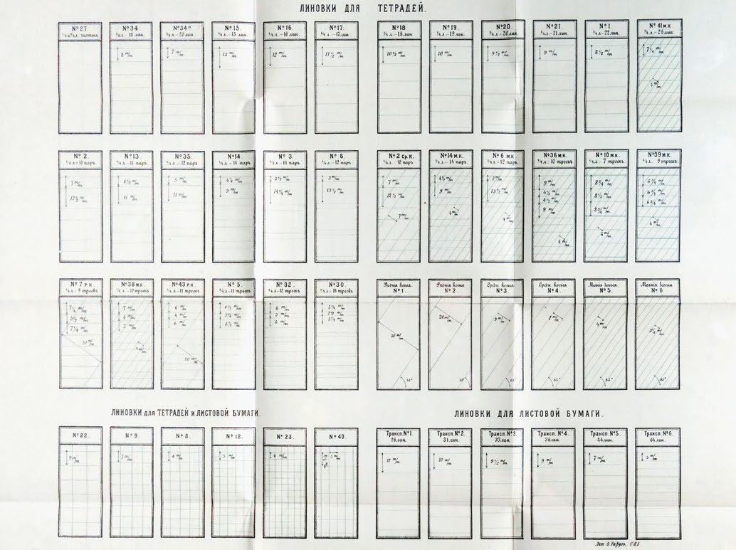 Пойдём по порядку. Казалось бы, зачем 48? Один мой знакомый полиграфист прокомментировал это так: «Если для людей было важно совмещение цвета носков и подтяжек для носков, а не только совмещение цвета галстука с цветом подтяжек для брюк, то они, конечно, могли позволить себе и 48 линовок. Следы высокоразвитой цивилизации…». А если серьёзно, то существовало прямое и наклонное письмо, круглый шрифт использовали для карт и чертежей, альбомы для рисования также линовали крупной клеткой и обучали рисовать по ней, линовали альбомы для марок и т. д. Но основным назначением линовки всё же была выработка у учащихся начальной школы навыка красивого письма и каллиграфического стиля, что само по себе являлось делом основательным и кропотливым. Для французского, немецкого, греческого, латыни существовали тетради со свой линовкой, да ещё и отдельно с наклонным и прямым письмом. Для различных ступеней обучения также предназначалась своя линовка. Подозреваю, что у учеников, например, гимназии 2-го класса реального училища были свои тетради с разными линовками. Отдельно замечу, что, по Прейс-Куранту Паллизена, «счетовых» линовок (для конторских тетрадей и книг) было 14 видов, нотных – 3 вида, а линовок почтовой бумаги – 4. Отчасти, мой знакомый полиграфист был прав…