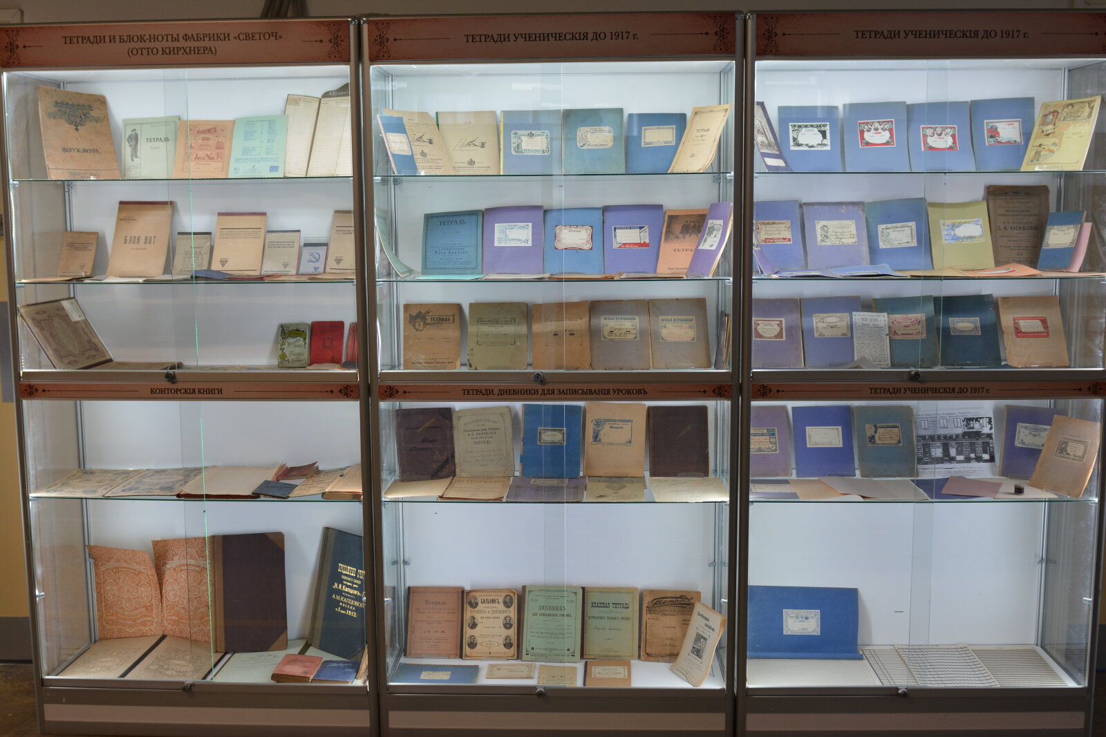 Экспонаты Отраслевого канцелярского музея, коллекция тетрадей И.М. Зайцева.